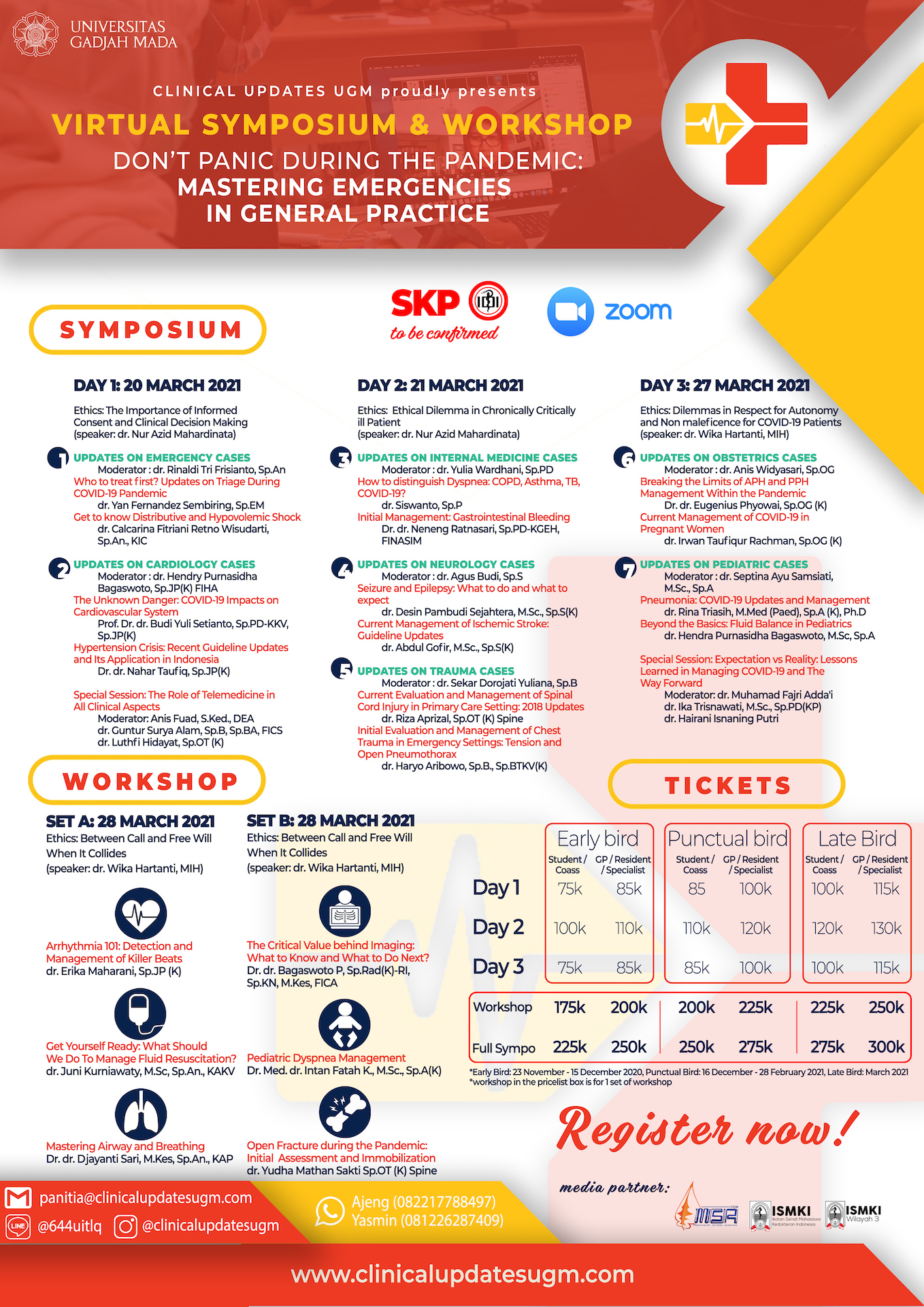 Tahun ini, 2021, panitia Clinical Updates UGM mengundang Anda para dokter dan calon dokter se-indonesia untuk mengikuti Clinical Updates tahun ini dengan tema “Emergency Setting During the Pandemic in General Practice”. Terdapat total 7 virtual simposium dan 6 virtual workshop interaktif yang disajikan oleh pembicara-pembicara terbaik kami. Selain itu, kami juga akan menghadirkan sesuatu yang istimewa tahun ini, dengan “Special Session” yang akan mengungkap dan menyoroti peran individu yang dalam menghadapi pandemi COVID-19 di Indonesia.