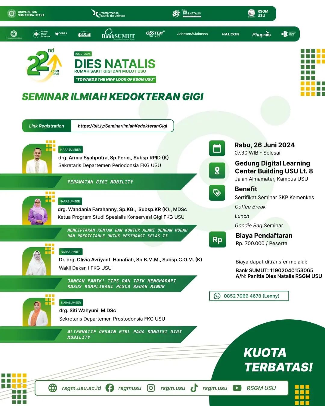 Dalam rangka Dies Natalis RSGM USU Ke-22, RSGM USU @rsgm.usu akan menyelenggarakan SEMINAR ILMIAH KEDOKTERAN GIGI dengan Benefit SKP KEMENKES.
