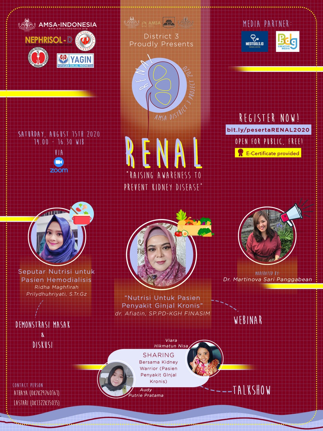 RENAL (Raising Awareness to Prevent Kidney Disease) merupakan acara yang diselenggarakan AMSA-Indonesia distrik 3. Kegiatan ini bertujuan untuk meningkatkan kesadaran dan wawasan mengenai penyakit ginjal dan bagaimana mencegahnya. Rangkaian kegiatan meliputi webinar, talkshow, dan fun cooking session.