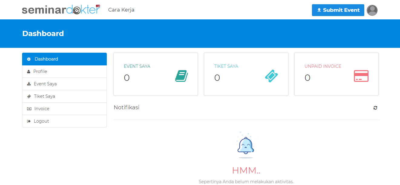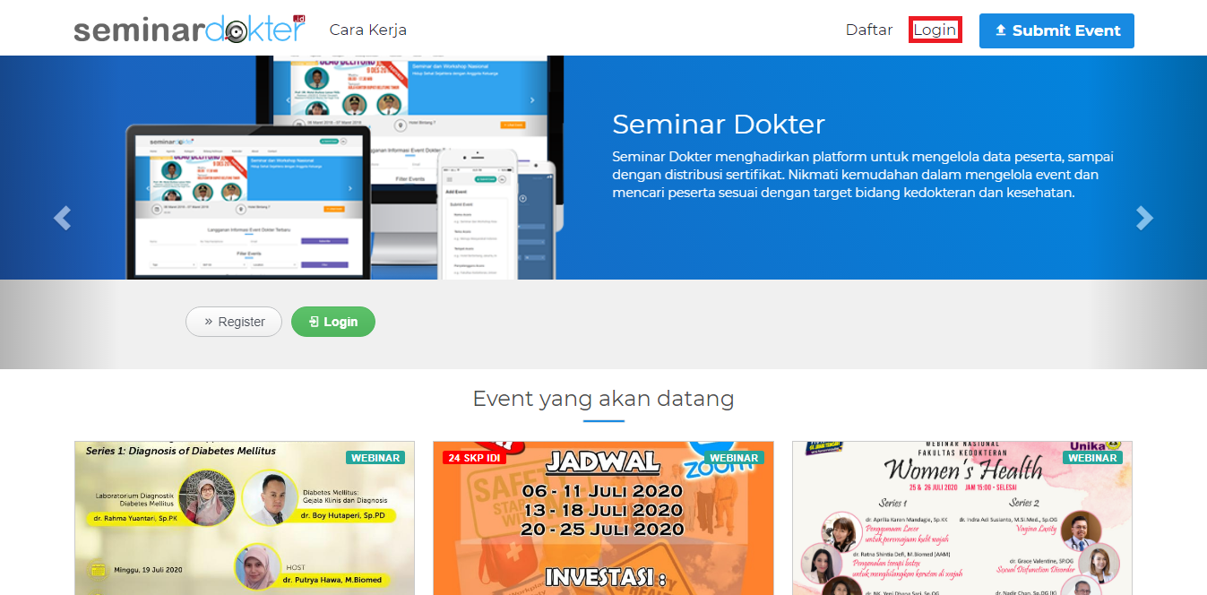 Tidak hanya pelatihan dan seminar secara offline, Anda juga bisa mempromosikan webinar yang sedang menjamur belakangan ini. Namun untuk melakukan promosi ini Anda harus login ke akun yang sudah dibuat di Seminardokter.