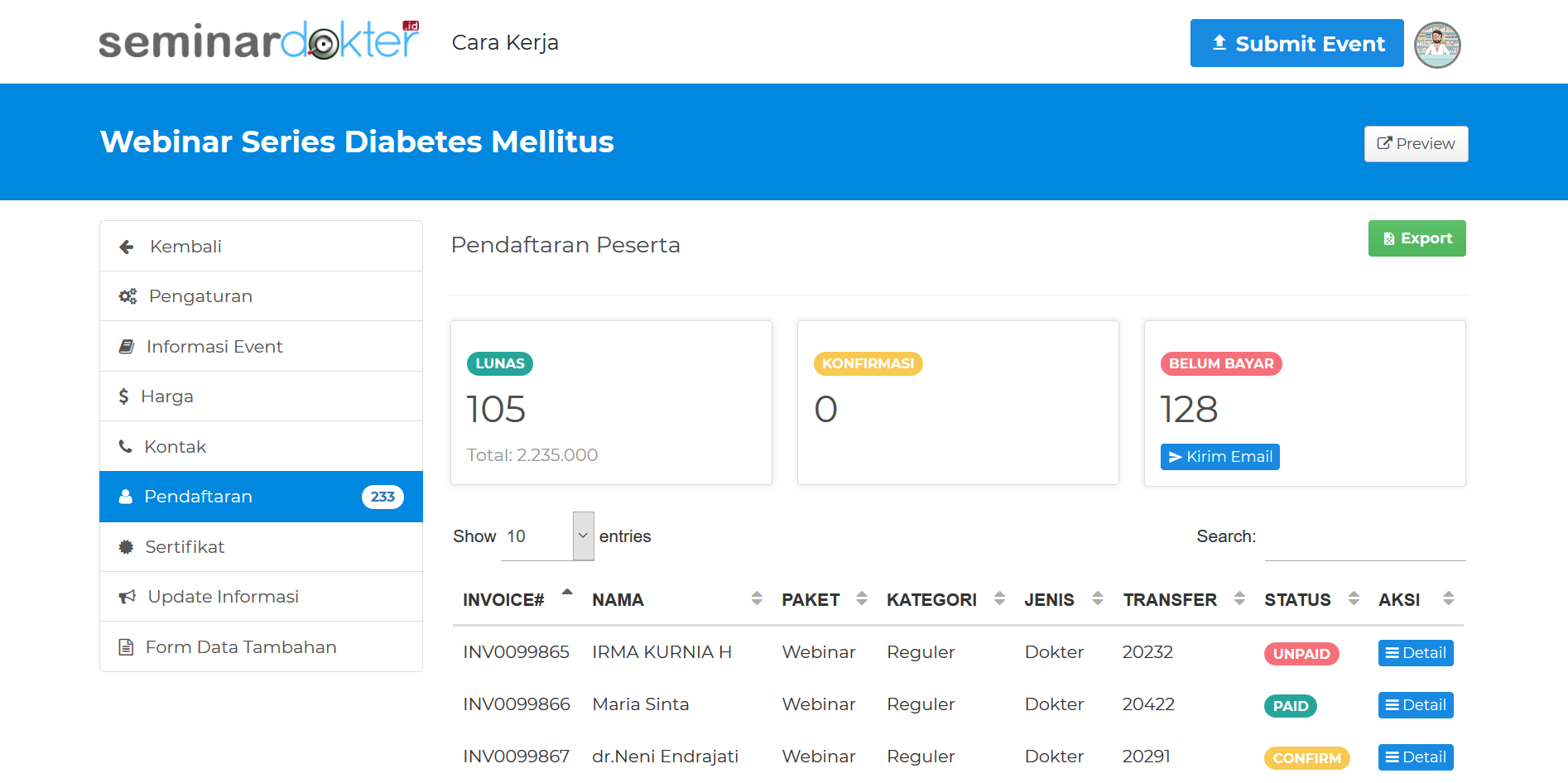 Setelah melakukan submit event dan memberikan informasi lengkap dan deskripsi event dengan jelas, maka kini saatnya Anda menunggu calon pendaftar. Pendaftaran para peserta bisa dilakukan melalui situs Seminardokter dengan mudah.