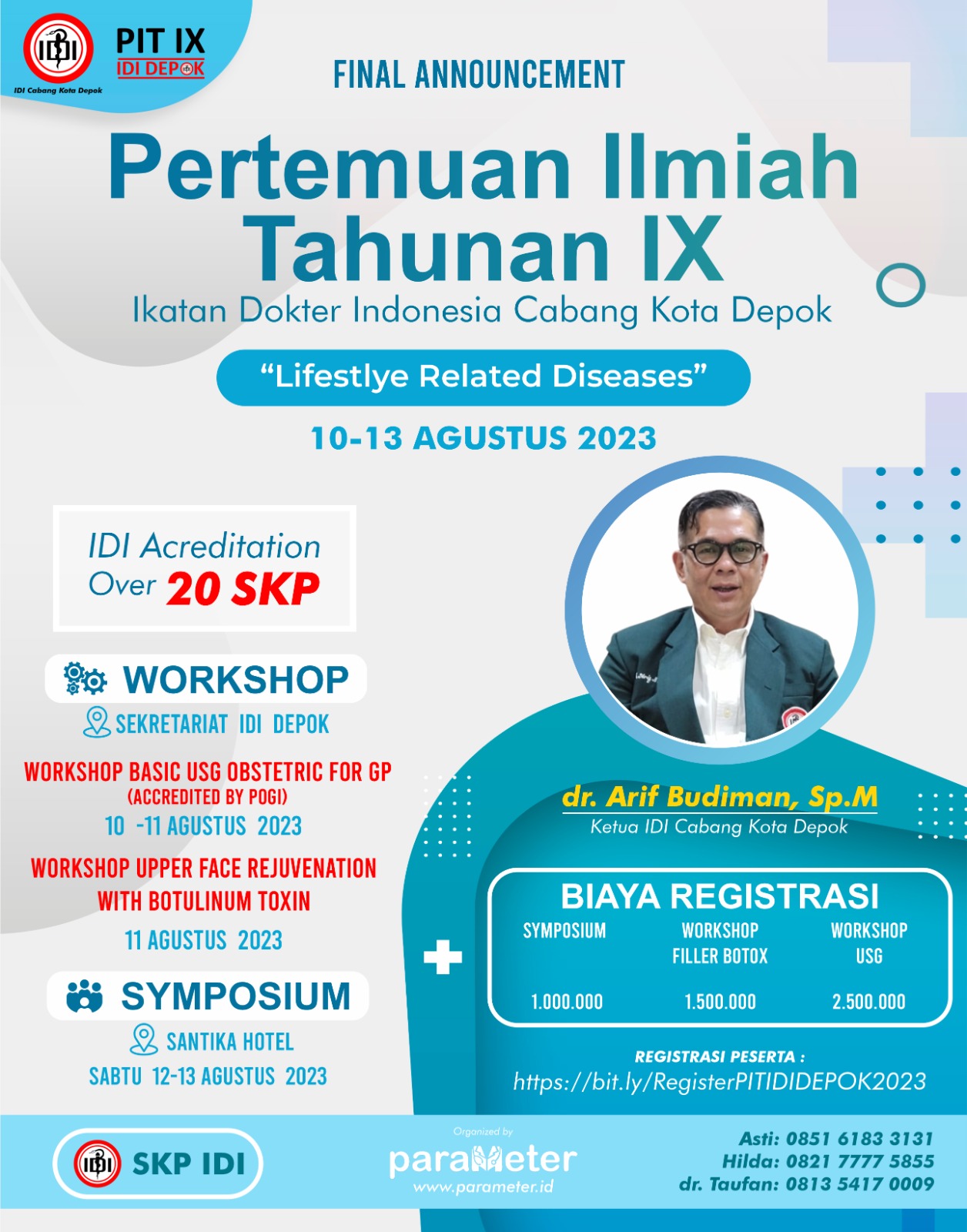 Pertemuan Ilmiah Tahunan IX (PIT IX IDI DEPOK) mengadakan kegiatan Symposium dan Workshop yang bertema Lifestyle Related Diseases yang akan dilaksanakan pada :