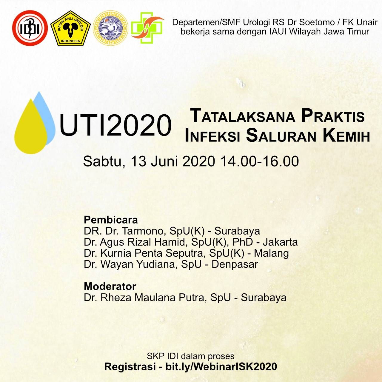 Departemen Urologi FK Unair akan mengadakan Seminar Tatalaksana Praktis Infeksi Saluran Kemih. Seminar ini diadakan secara online yang diselenggarakan atas kerjasama SMF Urologi RS Dr Soetomo dengan IAUI Wilayah Jawa Timur. Webinar online ini akan diselenggarakan pada Sabtu, 13 Juni 2020 pukul 14.00-16.00. Peserta dapat mengikuti webinar ini dengan mendaftarkan diri melalui link yang telah disediakan oleh panitia. Seminar ini disiapkan SKP IDI untuk peserta yang mengikuti seminar dari awal sampai akhir acara.