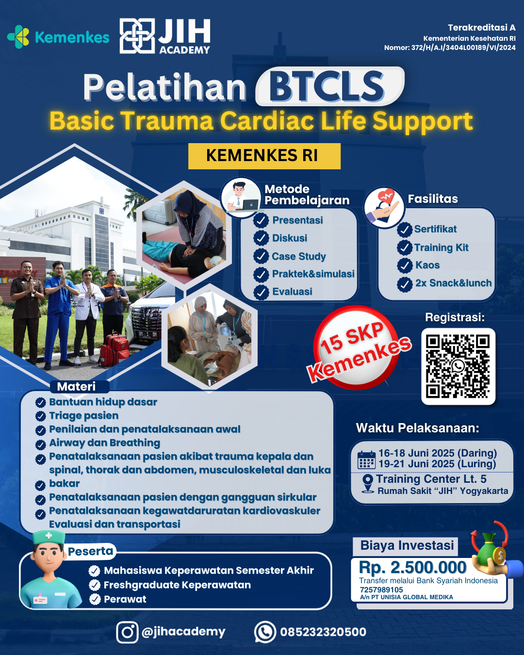 Halo NAKES DIY dan sekitarnya, kali ini JIH Academy akan mengadakan pelatihan BTCLS (Basic Trauma & Cardiac Life Support) yang pastinya bersertifikasi resmi Kementrian Kesehatan Republik Indonesia lho