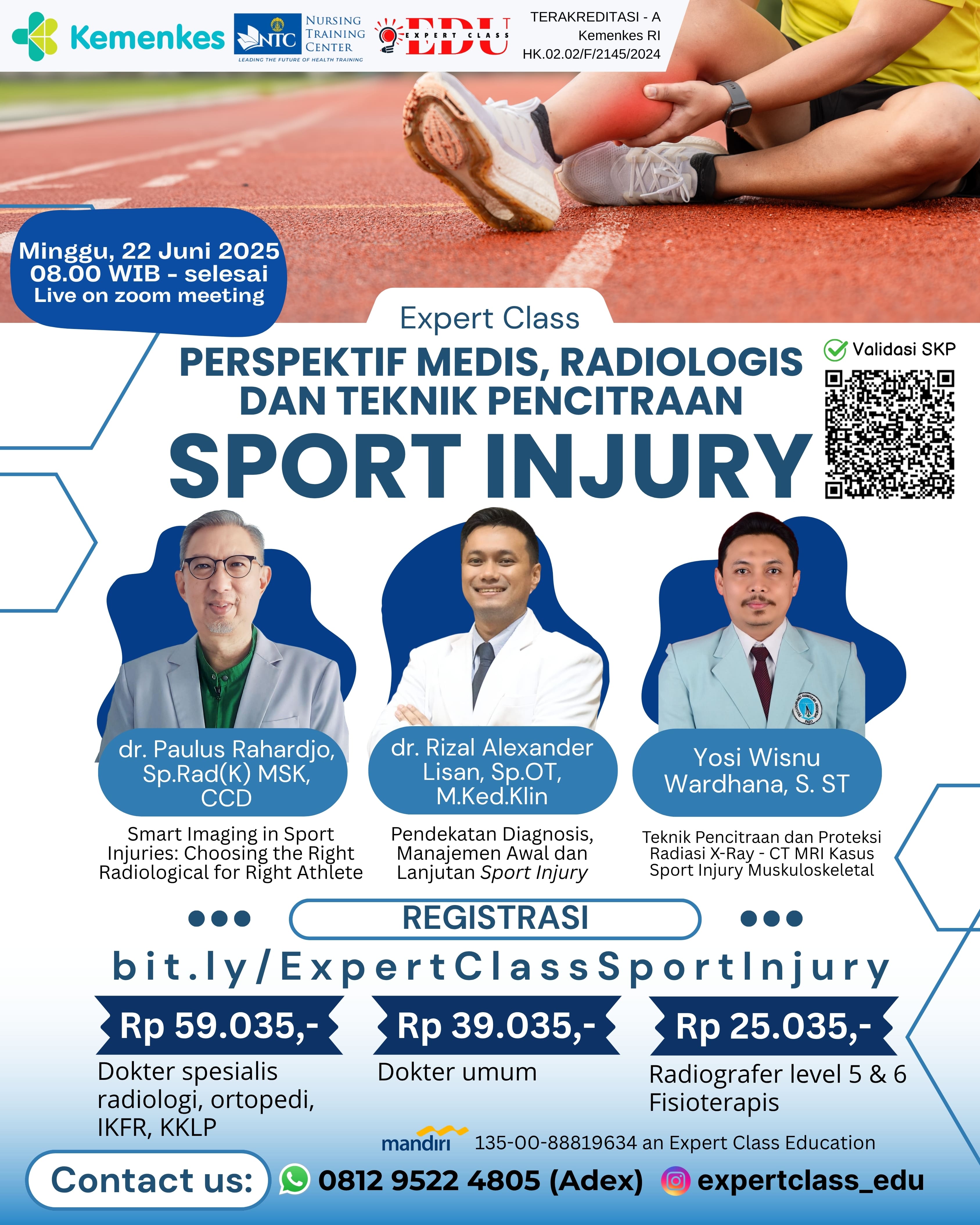 Rp 59.035,- (Dokter Spesialis Radiologi (2 SKP), Kedokteran Fisik dan Rehabilitasi Medik (2 SKP), Orthopaedi dan Traumatologi (5 SKP), Kedokteran Keluarga Layanan Primer (5 SKP))