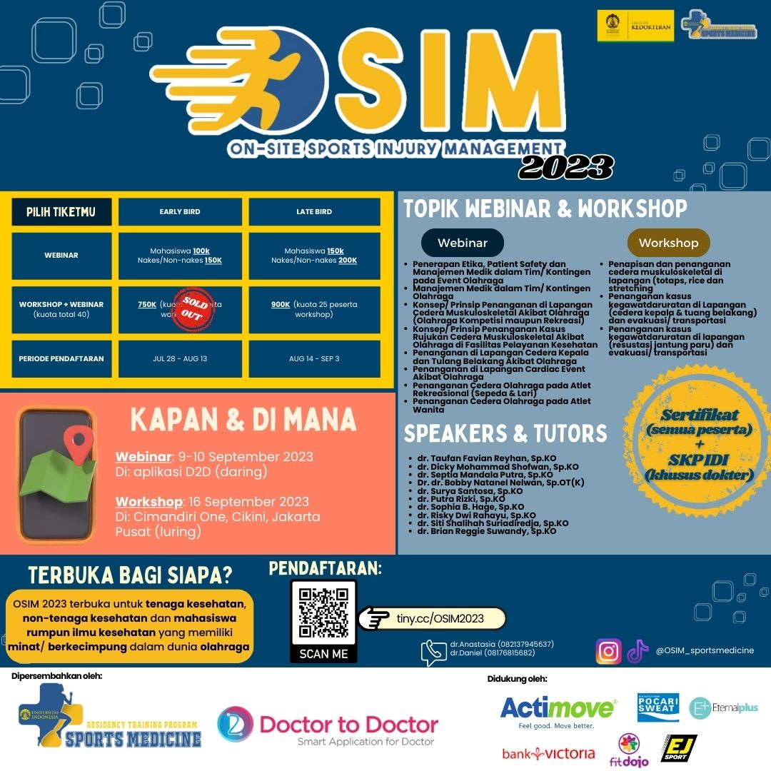 Acara rutin yang diselenggarakan oleh Program Studi Ilmu Kedokteran Olahraga Fakultas Kedokteran Universitas Indonesia, bertujuan untuk memberikan edukasi wawasan dan keterampilan penatalaksanaan cedera olahraga secara baik dan benar, bagi para dokter, perawat, fisioterapi, atau tenaga kesehatan maupun non-tenaga kesehatan yang banyak terlibat dalam dunia olahraga.OSIM 2023 diadakan melalui webinar tanggal 9 dan 10 September 2023 secara online (daring) dan workshop tanggal 16 September 2023 secara offline (luring) di Gedung Cimandiri One, Jakarta Pusat