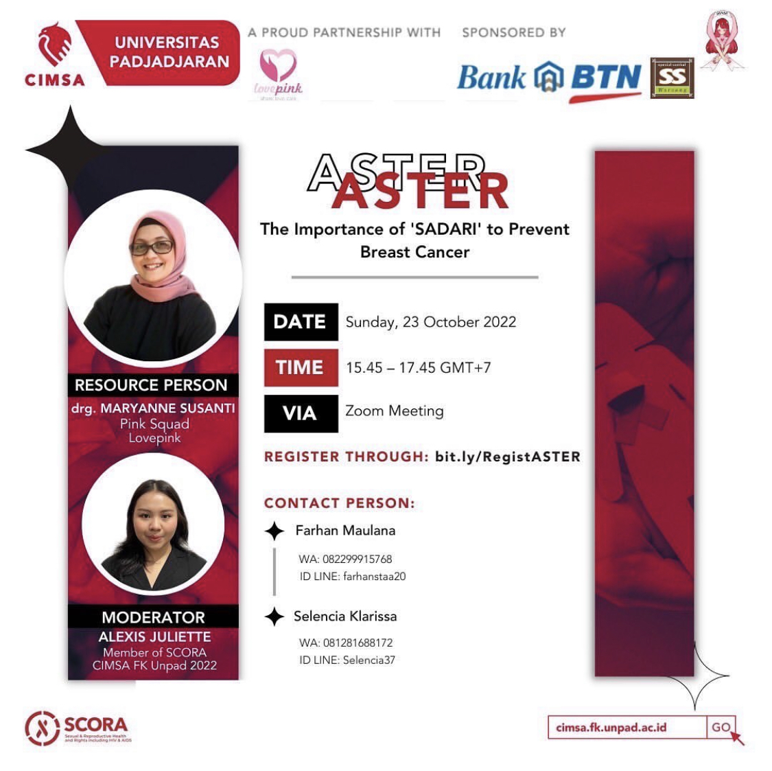 Oleh karena itu, untuk meningkatkan kesadaran dan meminimalisir jumlah kasus kanker payudara, SENSE (Strive for Awareness of Teenage Pregnancy and Breast Cancer) akan mengadakan Talk show online berdasarkan kesadaran yang disebut ASTER: Pentingnya Sadari untuk Mencegah Kanker Payudara, maka itu tandai kalender Anda dan jangan lewatkan kesempatan ini!