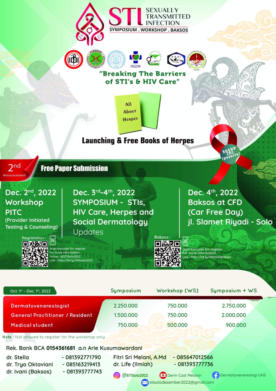 PERDOSKI cabang Surakarta, Kelompok Studi Infeksi Menular Seksual Indonesia (KSIMSI), Kelompok Studi Herpes Indonesia (KSHI), Kelompok Studi Dermatologi Sosial Indonesia (KSDSI), Dermatologi dan Venereologi Universitas Sebelas Maret, Surakarta dengan bangga mempersembahkan