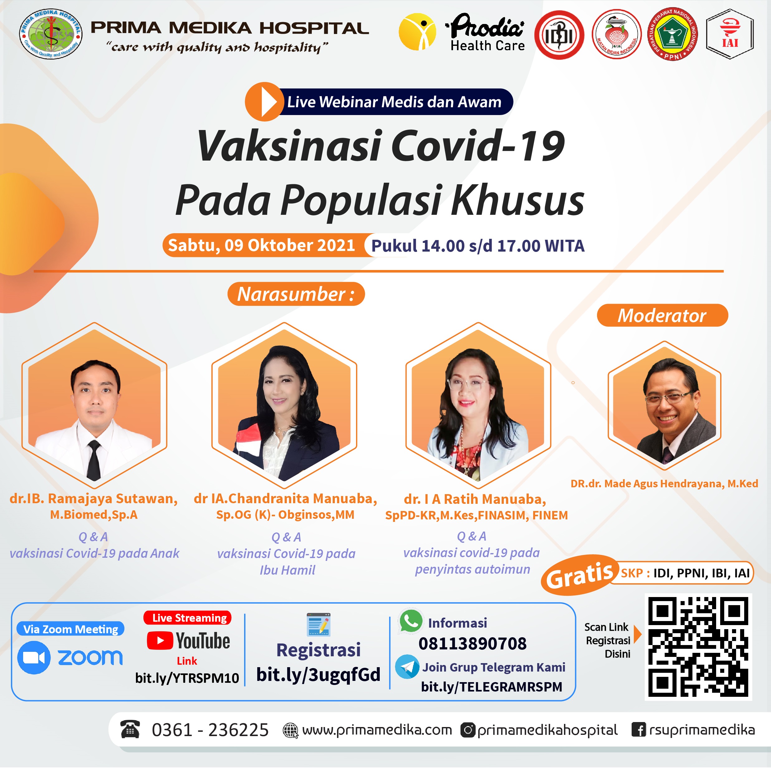Melalui webinar kali ini RS. Prima Medika (RSPM) Denpasar menampilkan 3 narasumber untuk menjawab pertanyaan pertanyaan terkait Vaksinasi Covid-19 Pada Populasi Khusus
