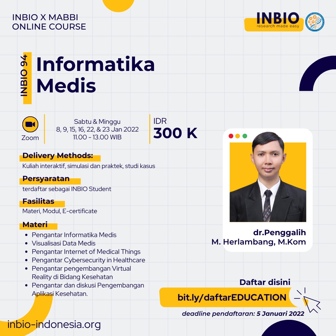Online course ini merupakan agenda rutin tiap bulan yang diadakan oleh Inbio Indonesia dengan membuka beberapa topik-topik yang berhubungan dengan Bioinformatika, biologi kedokteran dan life sciences dengan pemateri yang cukup berpengalaman di bidangnya. Pelaksanaan online course ini dilaksanakan pada hari sabtu dan minggu dimulai dari tanggal 8 - 23 Januari 2022. Manfaat yang akan didapatkan peserta dalam event ini adalah, rekaman video pembelajaran, modul pembelajaran, dan sertifikat. Untuk Pendaftarannya bisa langsung registrasi di website Inbio Indonesia http://bit.ly/daftarEDUCATION atau menghubungi admin 082229872305.