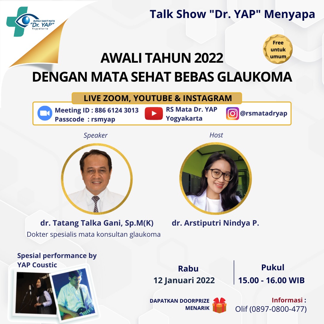 Glaukoma merupakan kelainan mata yang ditandai dengan kerusakan saraf mata yang berhubungan dengan hilangnya lapang pandangan. Glaukoma dapat dialami oleh siapa saja dan kapan saja. Lantas, apa saja faktor risiko, gejala dan penanganan Glaukoma? Mari kita simak penjelasannya melalui Talk Show "Dr. YAP" Menyapa dengan tema "Awali Tahun 2022 dengan Mata Sehat Bebas Glaukoma" yang akan dilaksanakan :
