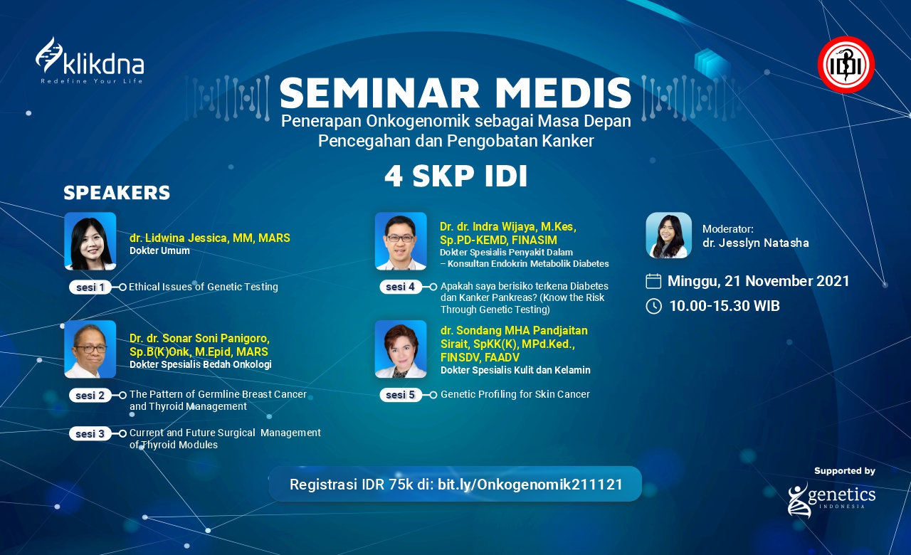 Bagaimana DNA dapat mencegah serta mengobati penyakit kanker pada manusia? Pelajari selengkapnya melalui seminar KlikDNA dan dapatkan 4 SKP IDI: