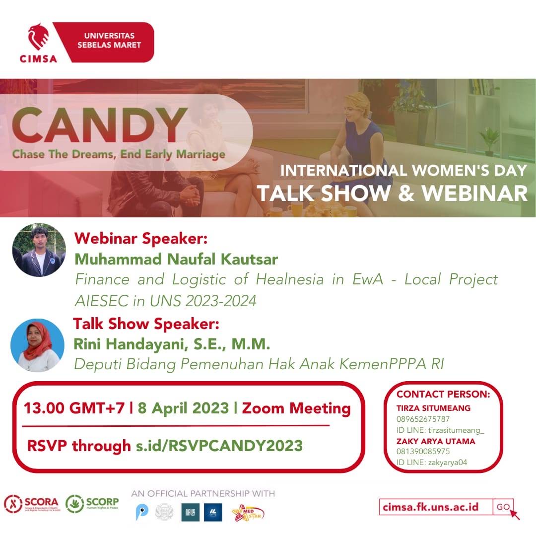 Talkshow Candy ini merupakan rangkaian acara terakhir dari 4 rangkaian acara yang diselenggarakan oleh CIMSA FK UNS SCORA x SCOPH. Diadakannya talkshow ini bertujuan untuk mengedukasi sekaligus mencegah maraknya pernikahan dini yang masih sering terjadi di masyarakat. Dalam talkshow ini terdapat dua sesi yaitu sesi talkshow dan webinar.