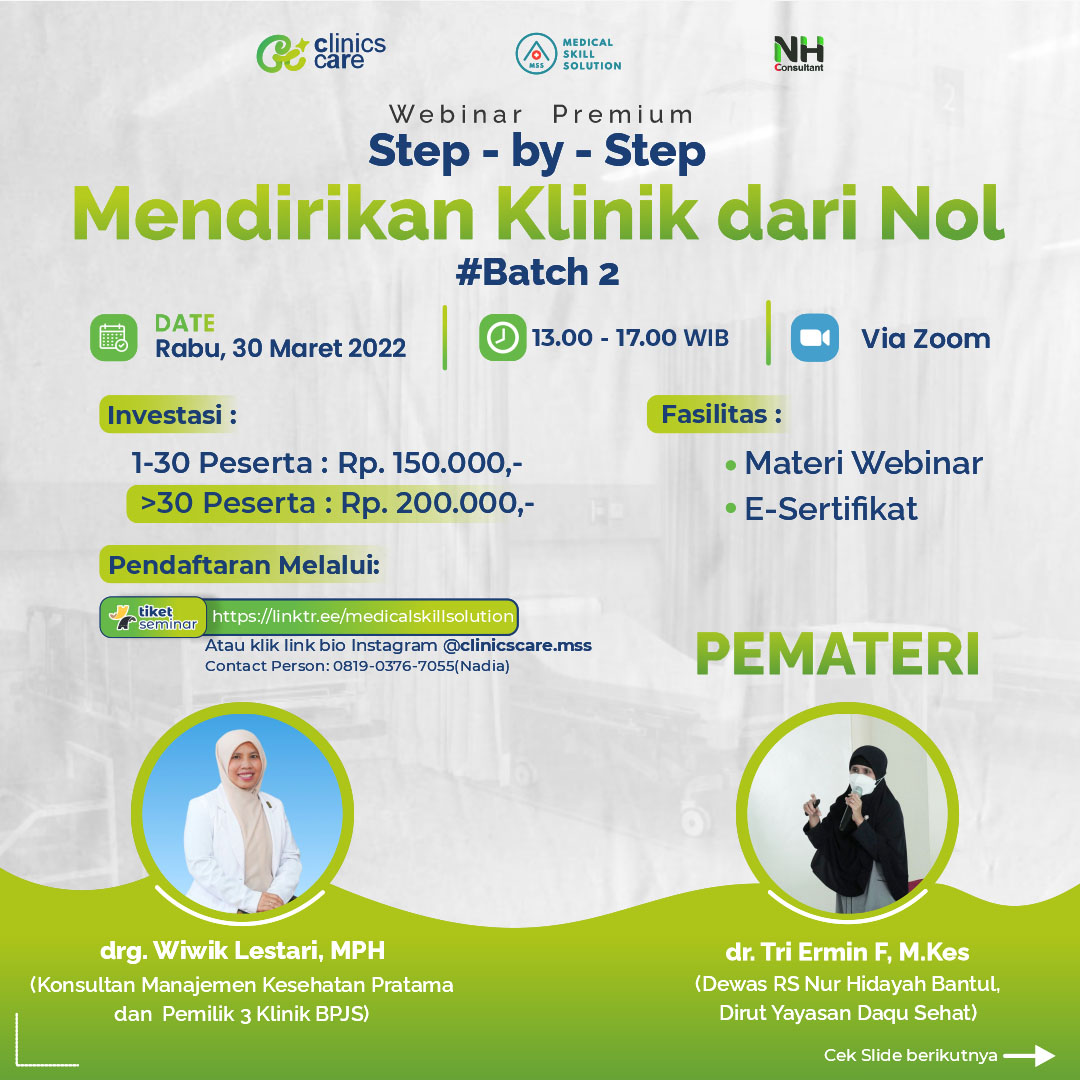 - FREE life-time akses Webinar seputar Klinik dan Praktek Dokter Mandiri Senilai Rp 200.000/Webinar