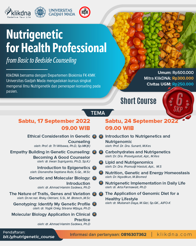 KlikDNA bersama dengan Departemen Biokimia FK-KMK Universitas Gadjah Mada mengadakan kursus singkat mengenai Ilmu Nutrigenetik dan penerapan konseling pada pasien. Peserta lulus akan mendapatkan 6 SKP IDI.