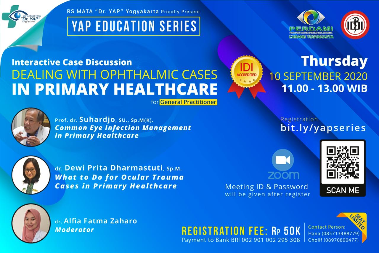 RS Mata "Dr.Yap" dengan bangga mempersembahkan YAP EDUCATION SERIES INTERACTIVE CASE DISCUSSION dengan Topik Dealing With Ophthalmic Cases in Primary Healthcare, yang akan dilaksanakan pada: