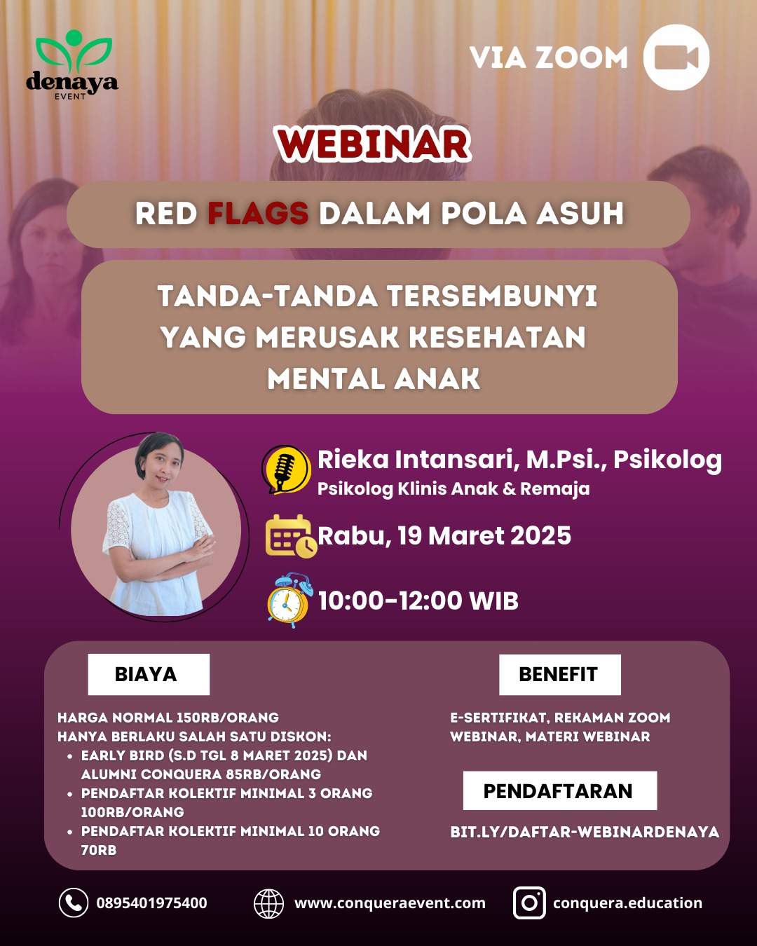 Webinar ini membahas berbagai tanda tersembunyi (red flags) dalam pola asuh yang dapat berdampak negatif pada kesehatan mental anak. Peserta akan mendapatkan wawasan tentang bagaimana pola interaksi orang tua memengaruhi perkembangan emosional anak, serta strategi pencegahan dan intervensi berbasis penelitian terkini. Webinar ini ditujukan bagi orang tua, pendidik, tenaga kesehatan, dan profesional yang peduli terhadap kesejahteraan psikologis anak.