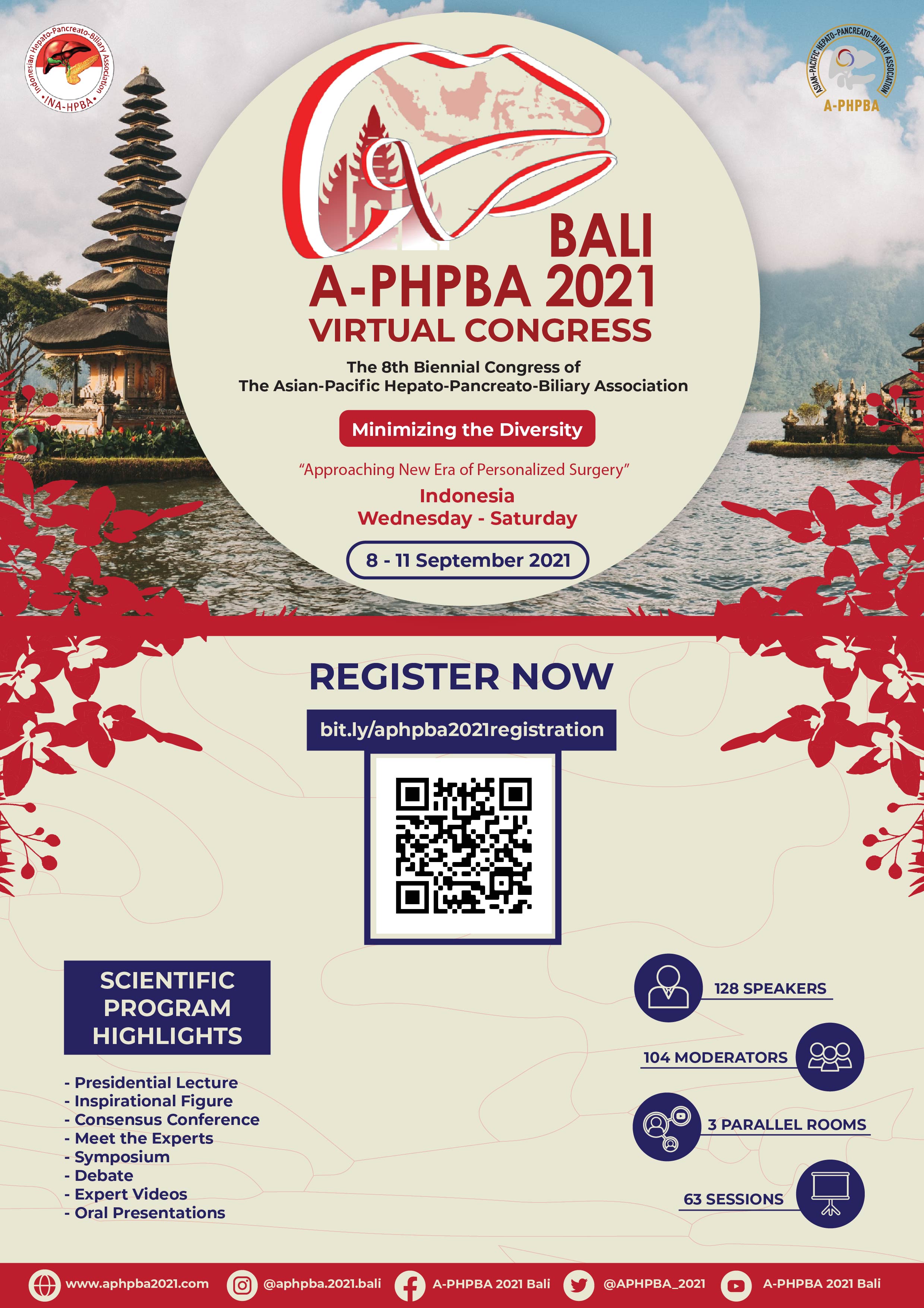 Be a part of The 8th Biennial Congress of The Asian-Pacific Hepato-Pancreato-Biliary Association (A-PHPBA) 2021 Bali - Virtual Congress to broaden your knowledge about Hepato-Pancreato-Biliary research in Minimizing the Diversity - Approaching New Era of Personalized Surgery in Asia Pacific region and meet delegates from all around the world virtually on 8-11 September 2021.