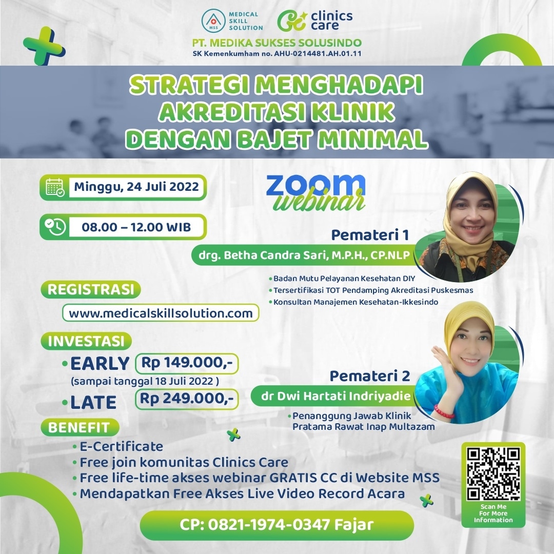 Clinics Care punya solusinya. Melalui Webinar Strategi Menghadapi Akreditasi Klinik dengan Bajet Minimal" Kita akan bocorin rahasia gimana caranya bisa sukses dalam akreditasi klinik. Karena kita menghadirkan Tenaga Ahli di Bidang akreditasi klinik yang juga merupakan konsultan faskes tersertifikasi resmi Ikkesindo.