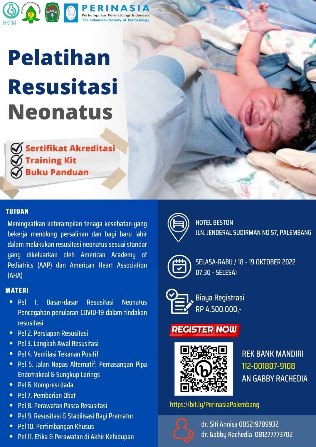 Dengan bangga kami mengundang dokter Sp.OG/Sp.A/Sp.An/Dokter Umum/Bidan/Perawat dalam acara Pelatihan Resusitasi Neonatus 2022 pada: