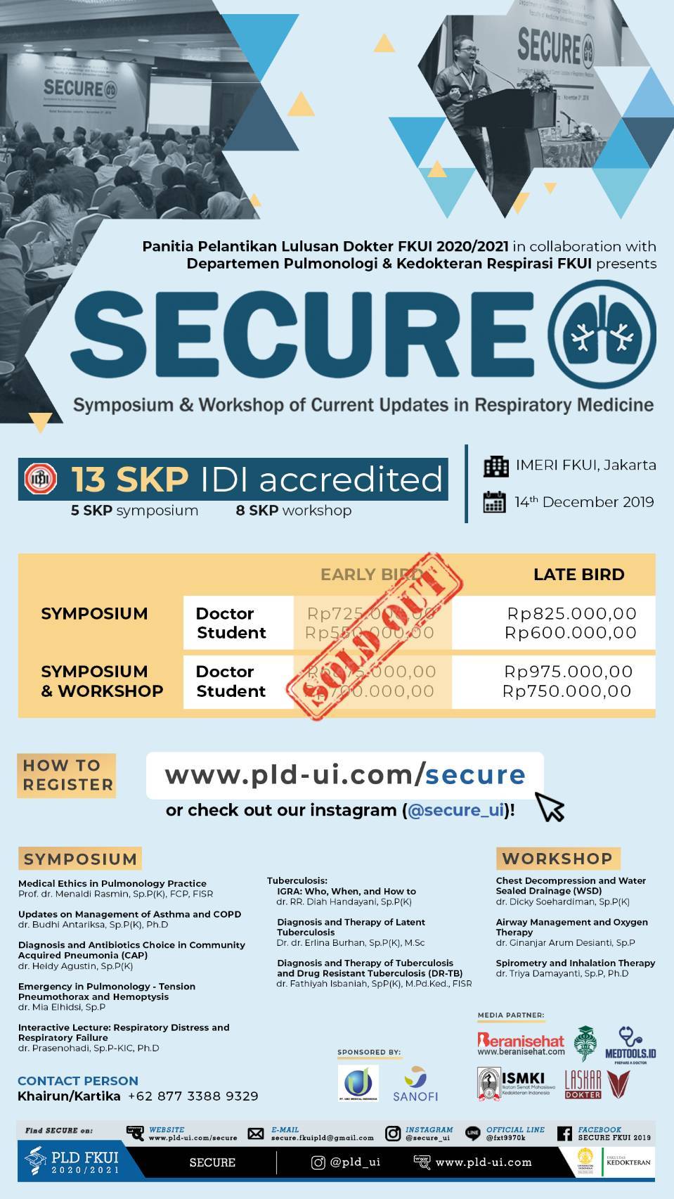 SECURE, a symposium and workshop event about updates in respiratory medicine, is presented by “Panitia Lulusan Dokter” Faculty of Medicine, Universitas Indonesia, in collaboration with pulmonologists from Department of Pulmonology and Respiratory Medicine, Faculty of Medicine, Universitas Indonesia – Persahabatan Hospital. The topics discussed are about infectious lung disease (e.g. pneumonia and tuberculosis), non-infectious lung disease (e.g. asthma and COPD), emergency in pulmonology (e.g. tension pneumothorax and hemoptysis), as well as clinical skills of general practitioner competence. This year, SECURE 2019 will be held in Jakarta and opened for medical students and medical doctors.