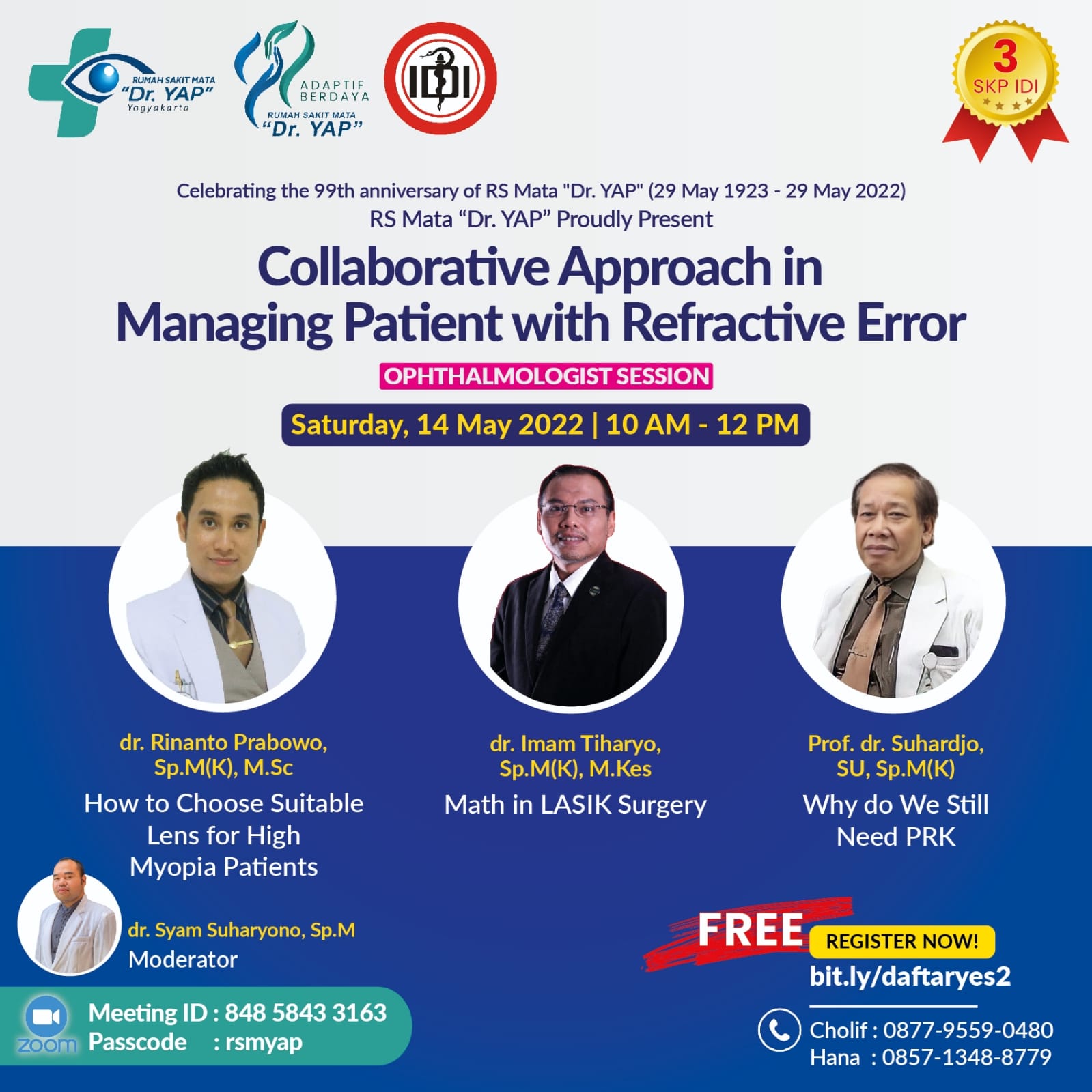 RS Mata "Dr. Yap" mempersembahkan YAP EDUCATION SERIES Edisi Spesial HUT Ke 99 RS Mata "Dr. Yap" dengan Topik "Collaborative Approach In Managing Patient With Refractive Error", yang akan dilaksanakan pada: