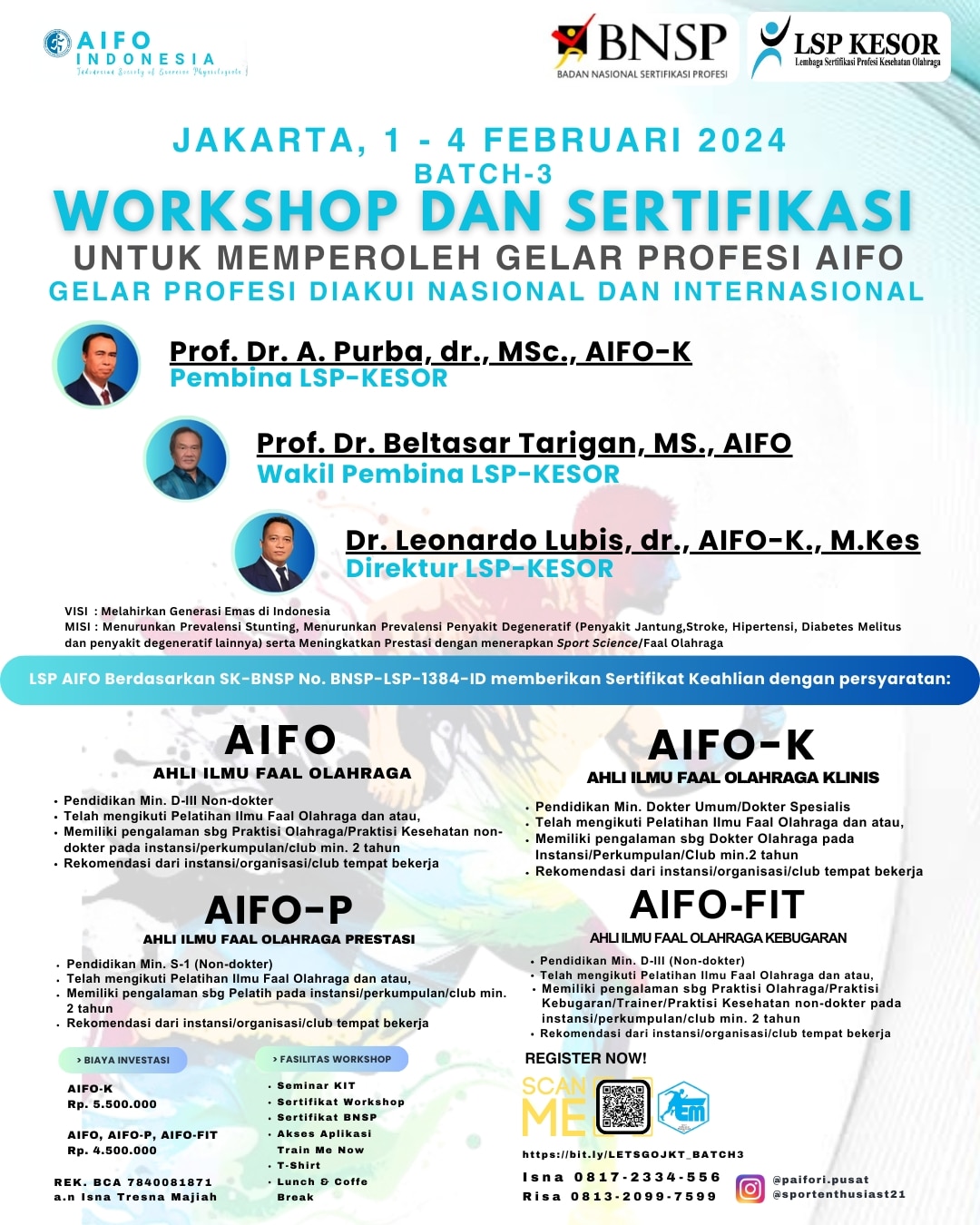 | Pelatiha Olahraga, Trainer Kebugaran, Perawat, Fisioterapi dan Nakes lainnya | 4.300.000 (Earlybird) | 4.500.000 (Reguler) |