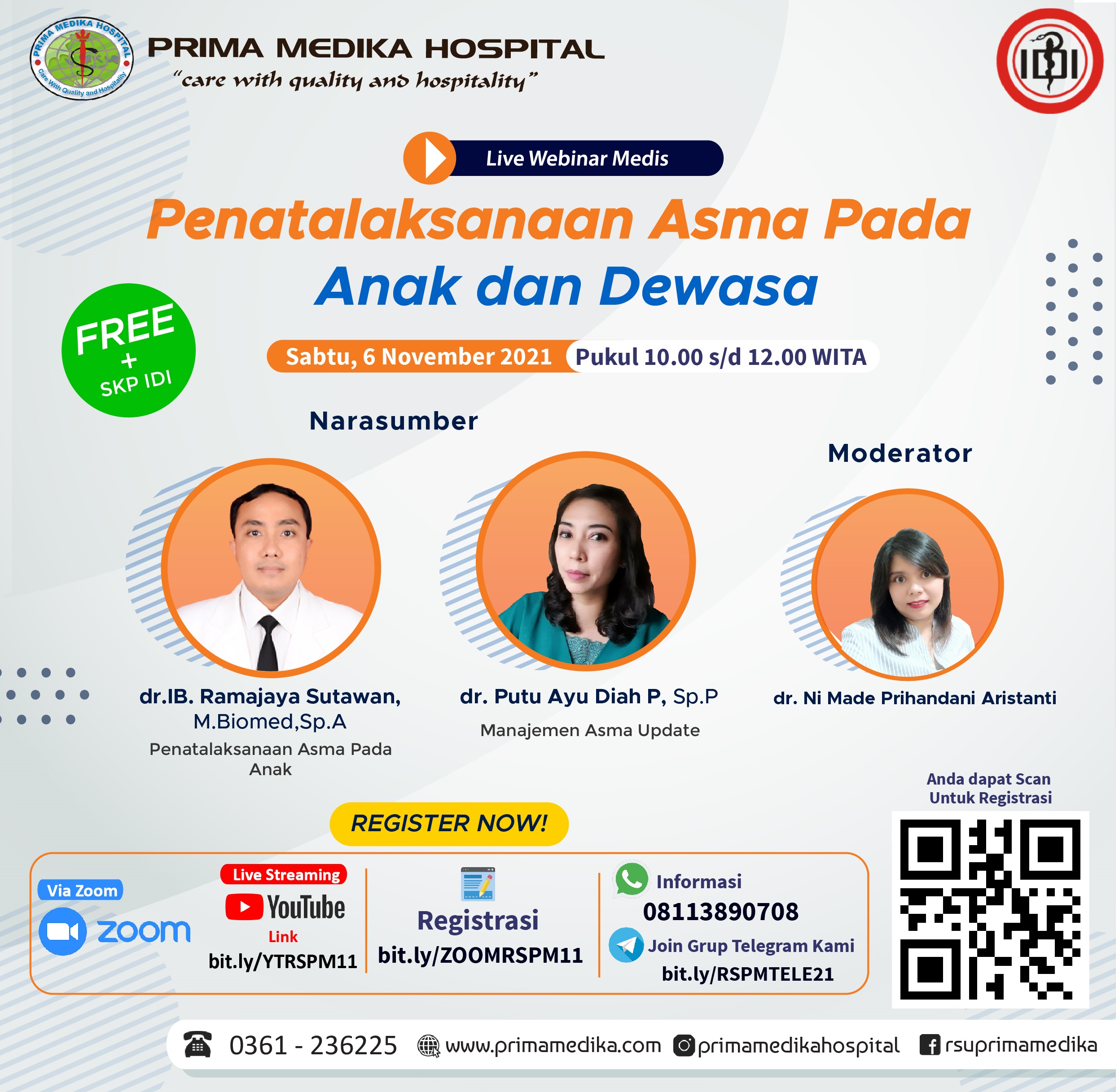 Dalam Upaya meningkatkan Pengetahuan dan Penatalaksanaan Asma pada Pasien Anak dan Dewasa, bagi Tenaga Medis kususnya Dokter Umum, Prima Medika Hospital akan menyelengarakan Webinar Medis dan Awam dengan tema Penatalaksanaan Asma Pada Anak dan Dewasa . Selain untuk para peserta medis, webinar ini juga dapat menambah pengetahuan bagi Masyarakat Awam mengenai penanganan Asma pada Anak dan Dewasa, serta bisa berkonsultasi langsung dengan para Narasumber.