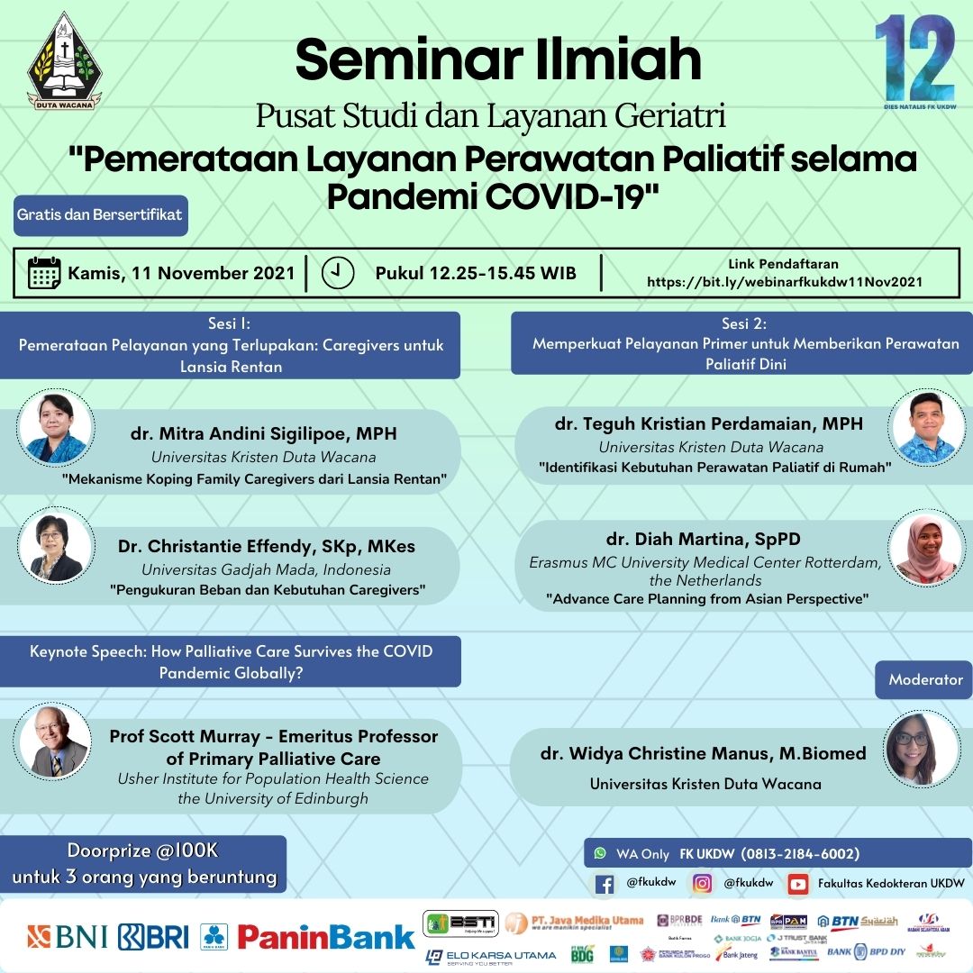 Panitia Dies Natalis ke 12 Fakultas Kedokteran Universitas Kristen Duta Wacana (FK UKDW) dan Pusat Studi dan Layanan Geriatri FK UKDW mengadakan Webinar Pemerataan Layanan Perawatan Paliatif selama Pandemi COVID-19 yang akan dilaksanakan pada: