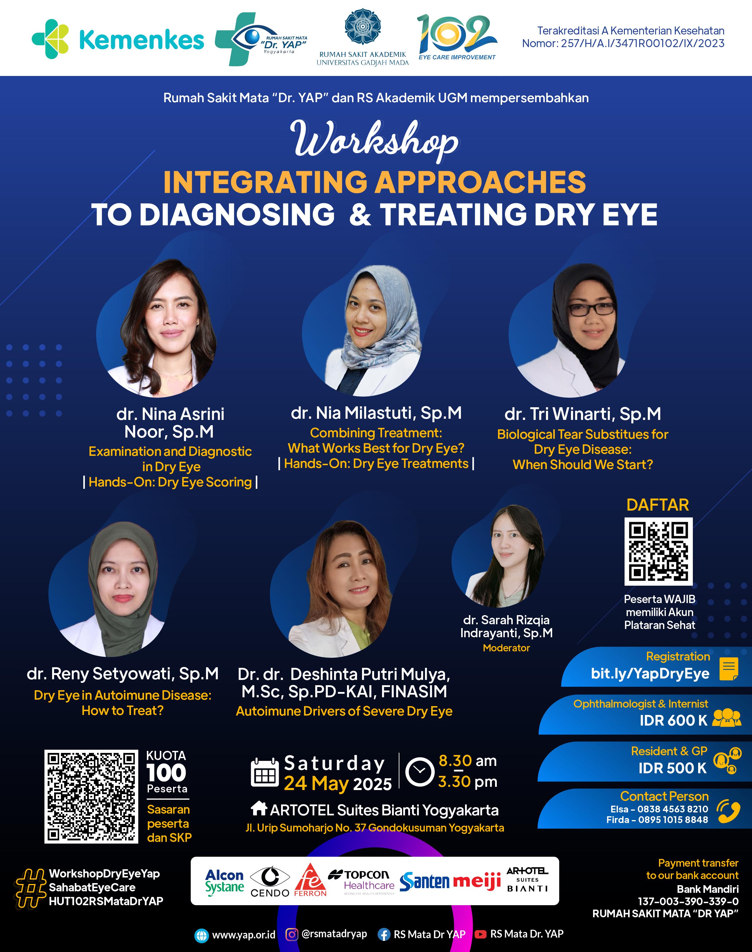 Workshop ini bertujuan untuk mengupas berbagai pendekatan diagnostik serta metode terapi yang lebih efektif dan berbasis bukti. Dengan menghadirkan narasumber yang kompeten di bidangnya, workshop ini diharapkan dapat memberikan wawasan yang lebih luas mengenai strategi diagnostik berbasis teknologi serta terapi terkini yang dapat meningkatkan kualitas hidup pasien dengan mata kering.