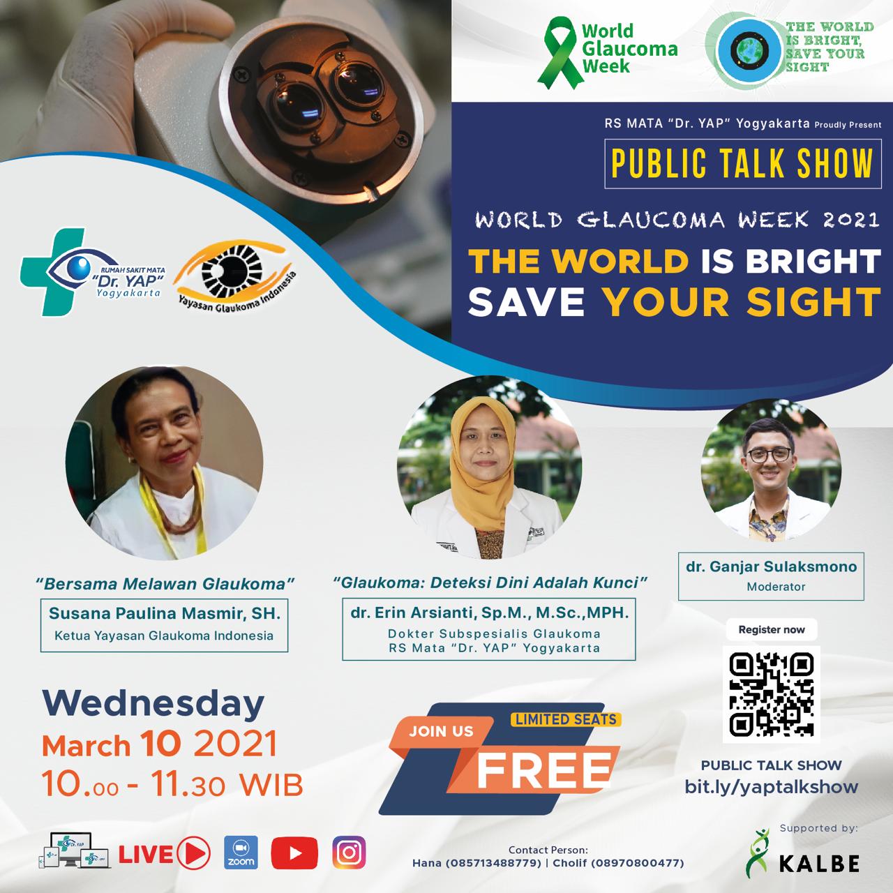Dalam rangka meningkatkan pengetahuan dan kepedulian masyarakat terhadap pentingnya deteksi dini Glaukoma, maka Rumah Sakit Mata "Dr. YAP" bermaksud menyelenggarakan Talkshow Publik Edisi Spesial World Glaucoma Week 2021 dengan tema "The World is Bright, Save Your Sight" yang akan dilaksanakan :