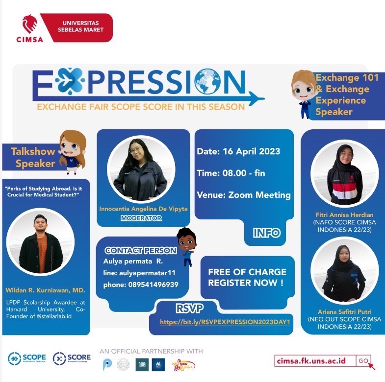 This year SCOPE and SCORE CIMSA FK UNS will hold Exchange Fair, a national campaign and routine activity every year. We will share and give new insight about Professional Exchange and Research Exchange with many impressive and inspirational speakers. Also, we will hold our Countries Expo and many other things that you shouldn't miss.