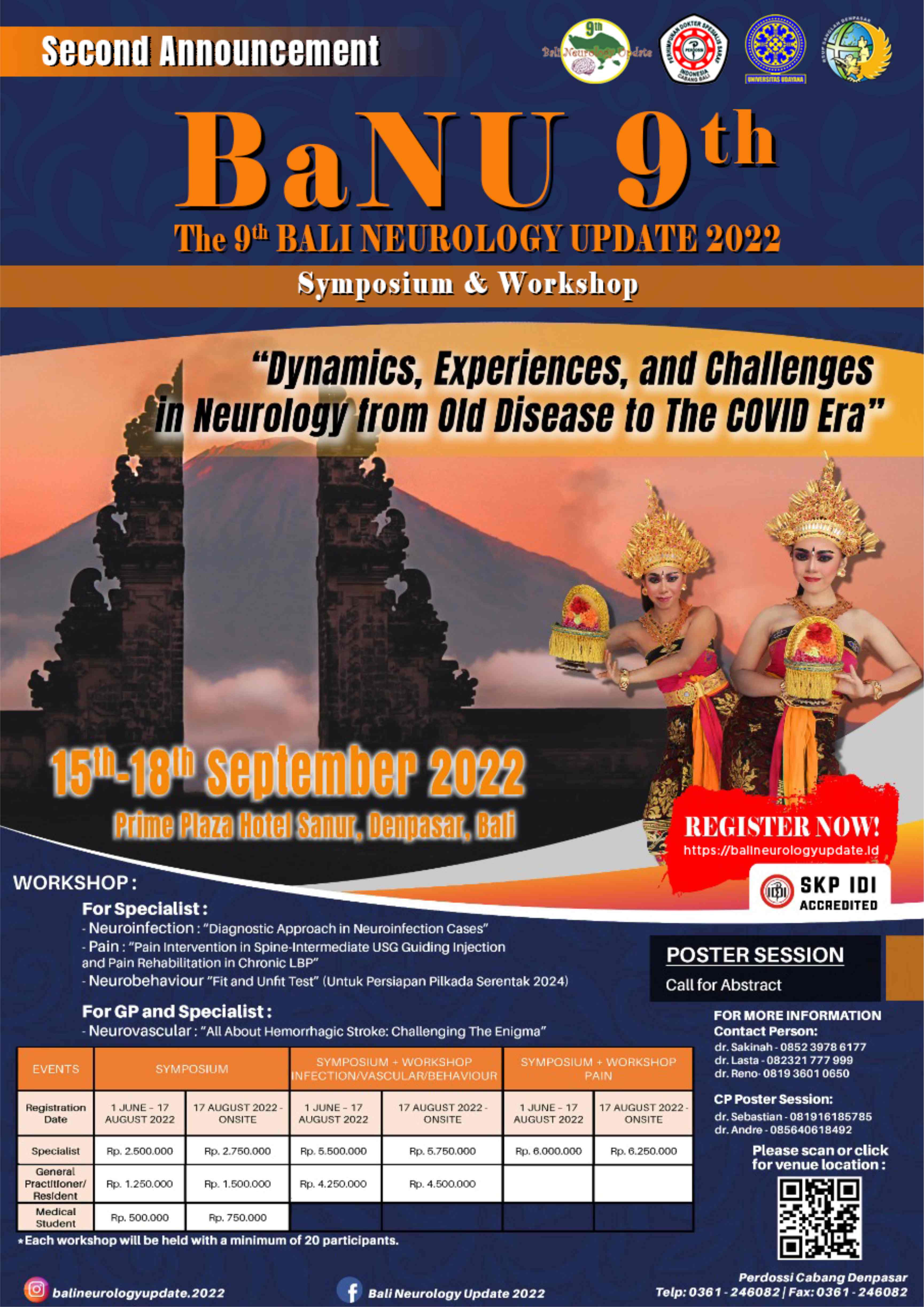 THE BALI NEUROLOGY UPDATE 9th (BaNU9th) has launched the 2nd-announcement for the 9th Symposium & Workshop that will take place in the Prime Plaza Hotel Sanur, Denpasar, Bali from 15th to 18th September, 2022.