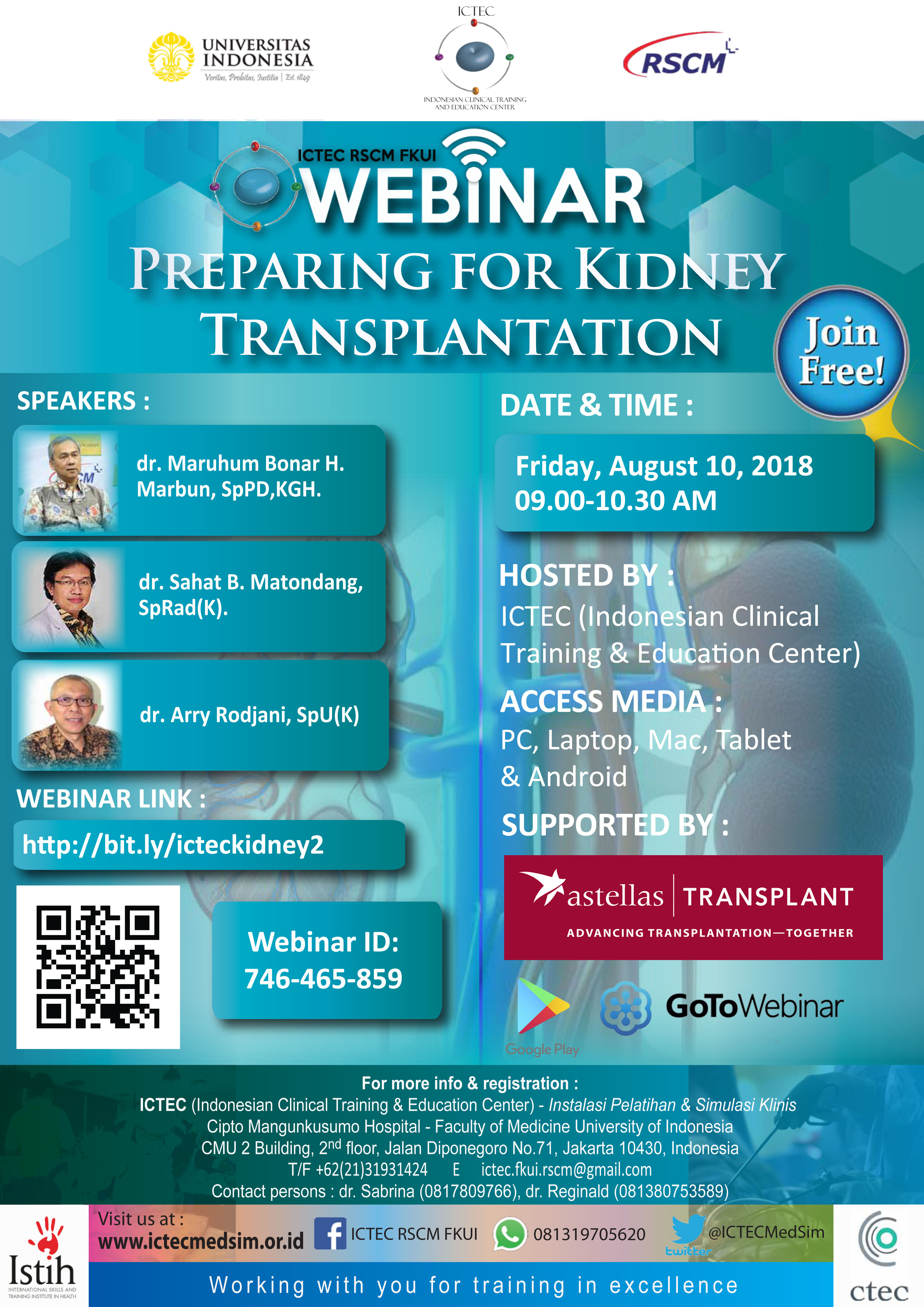 ICTEC bersama dengan Divisi Ginjal Dan Hipertensi, Departemen Urologi Departemen Radiologi RSUPN.Dr. Cipto Mangunkusumo & Astellas Transplant akan menyelenggarakan kegiatan knowledge & skill sharing melalui Web Conference pada: