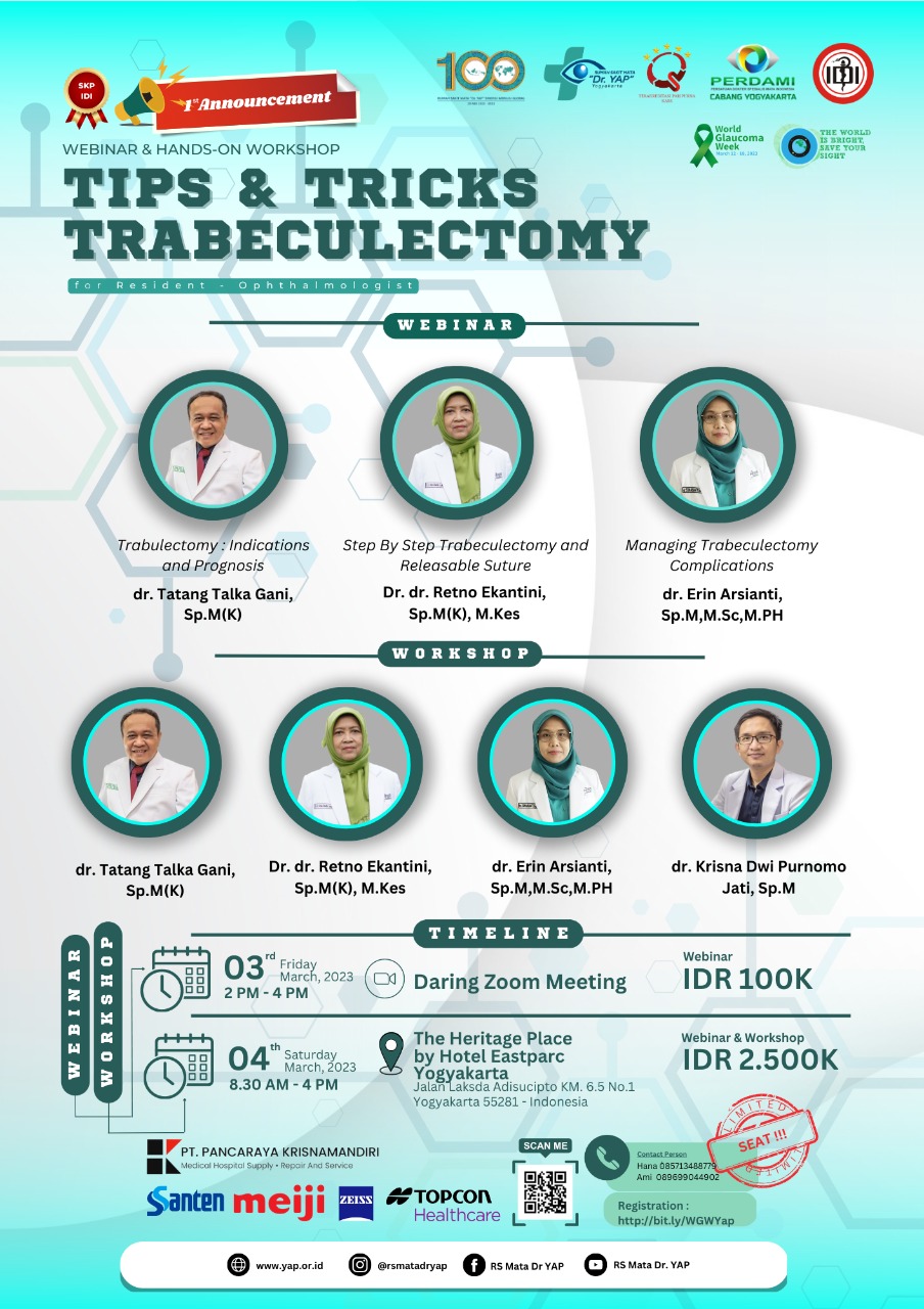Dalam rangka memperingati World Glaucoma Week 2023. Rumah Sakit Mata "Dr. Yap" menyelenggarakan Webinar dan Workshop Hands On dengan Tema "Tips and Trick Trabeculectomy", yang akan diselenggarakan pada :
