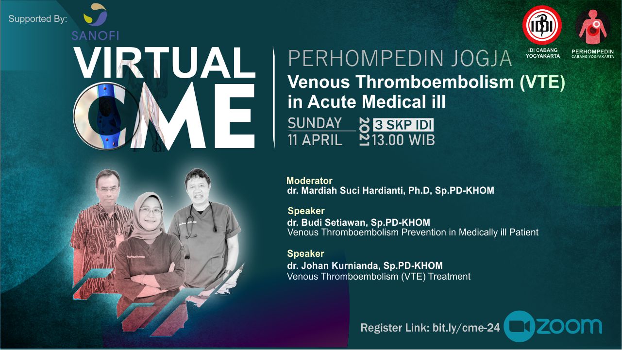 Perhompedin Cabang Yogyakarta dengan bangga mempersembahkan Virtual Continuing Medical Education (CME) seri ke 24 dengan Judul "Venous Thromboembolism (VTE) in Acute Medical ill".