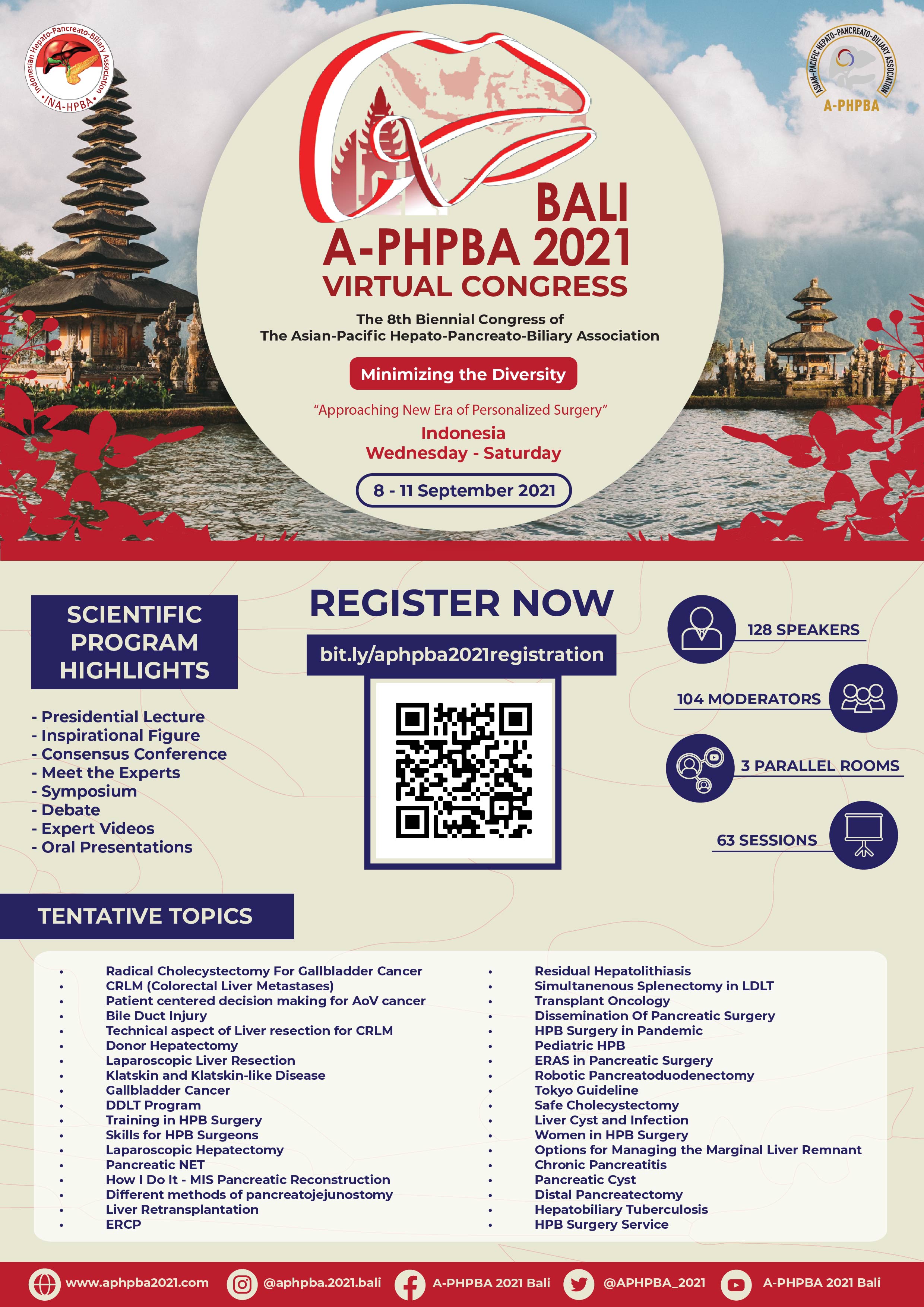Be a part of The 8th Biennial Congress of The Asian-Pacific Hepato-Pancreato-Biliary Association (A-PHPBA) 2021 Bali - Virtual Congress to broaden your knowledge about Hepato-Pancreato-Biliary research in Minimizing the Diversity - Approaching New Era of Personalized Surgery in Asia Pacific region and meet delegates from all around the world virtually on 8-11 September 2021.