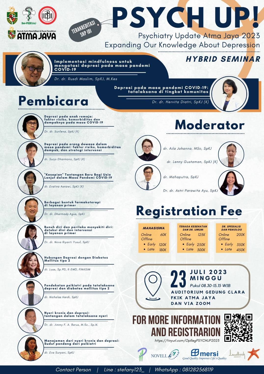 Psychiatry Update! (Psych Up!) Atma Jaya 2023 Expanding Our Knowledge About Depression, mengangkat tema yang membahas informasi terbaru seputar depresi. Acara tahun ini mengangkat topik mengenai pentingnya pengetahuan dalam mendeteksi, mendiagnosis, dan memberikan tatalaksana serta mengedukasi pasien dengan depresi, khususnya berkaitan dengan dampak pandemi; kaitan depresi dengan diabetes mellitus dan gangguan nyeri; pentingnya mengetahui waktu yang tepat untuk merujuk pasien psikiatri pada layanan primer kepada ahli.