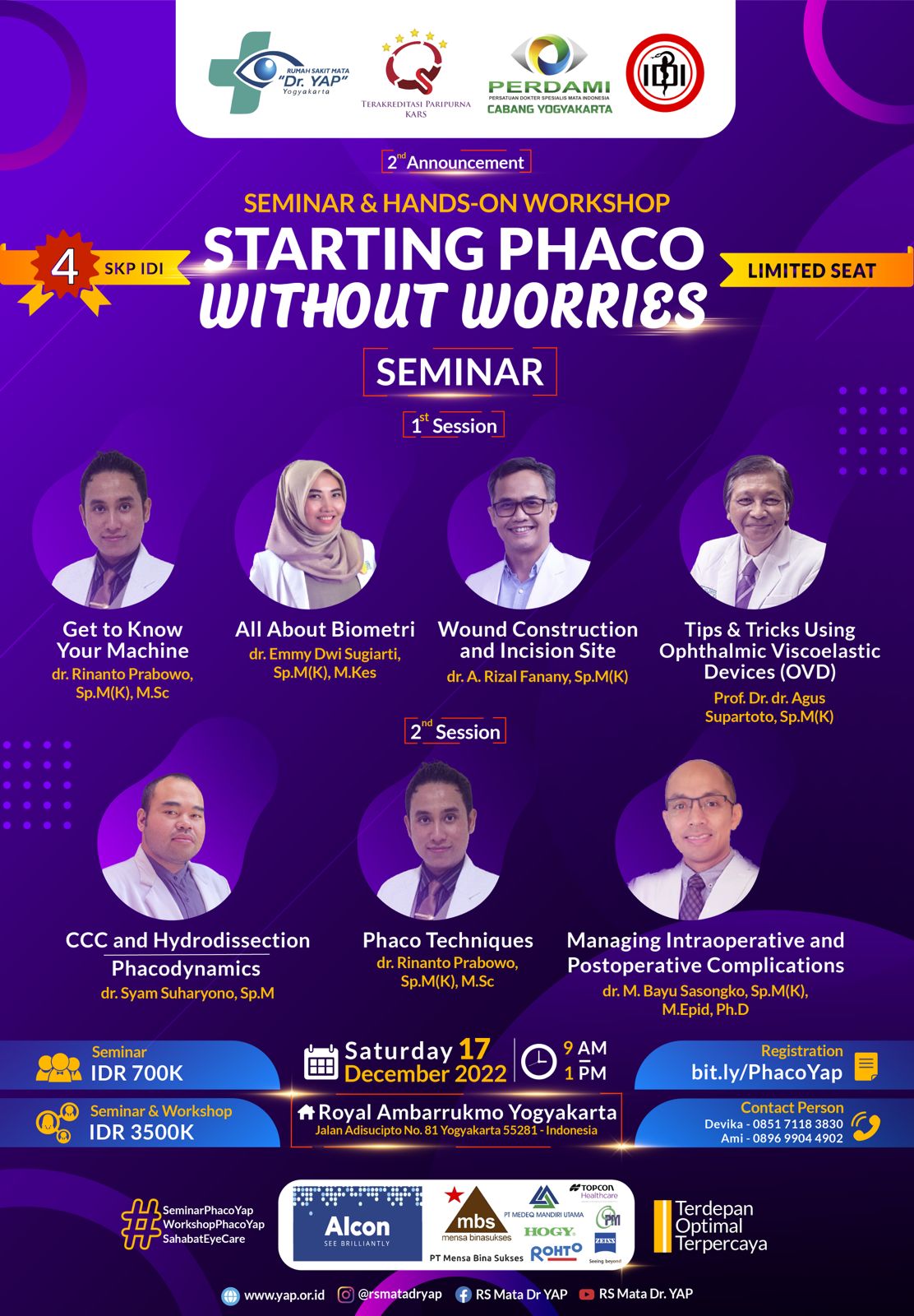 RS Mata "Dr.Yap" mempersembahkan Seminar dengan Tema "Starting Phaco Without Worries", yang akan dilaksanakan di Hotel Royal Ambarukmo Yogyakarta pada: