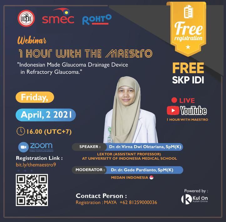 We would like to invite you for joining 1 Hour with The Maestro (9) by Virna Dwi Oktariana, MD, PhD (Indonesia): Indonesian Made Glaucoma Drainage Device in Refractory Glaucoma.