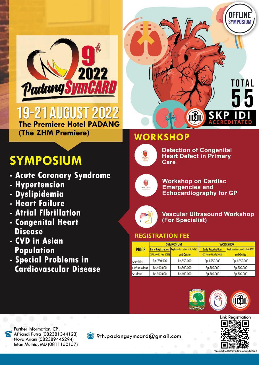Dalam rangka Symposium of Cardiovascular Disease yang ke - 9.Bagian Kardiologi dan Kedokteran Vaskular FK Unand- RSUP Dr. M. Djamil Padang dan PERKI Cabang Sumatera Barat mengundang Bapak/Ibu untuk mengikuti Simposium dan Workshop yang akan dilaksanakan secara offline pada :