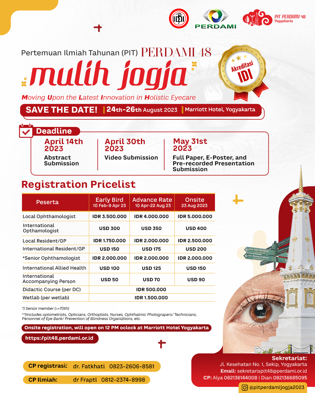 48th Annual Meeting of Indonesian Ophthalmologists Association (IOA) with theme "MULIH JOGJA: Moving Upon Latest Innovation Holistic Eyecare" will be held on August 24-26, 2023 at Marriott Hotel Yogyakarta.