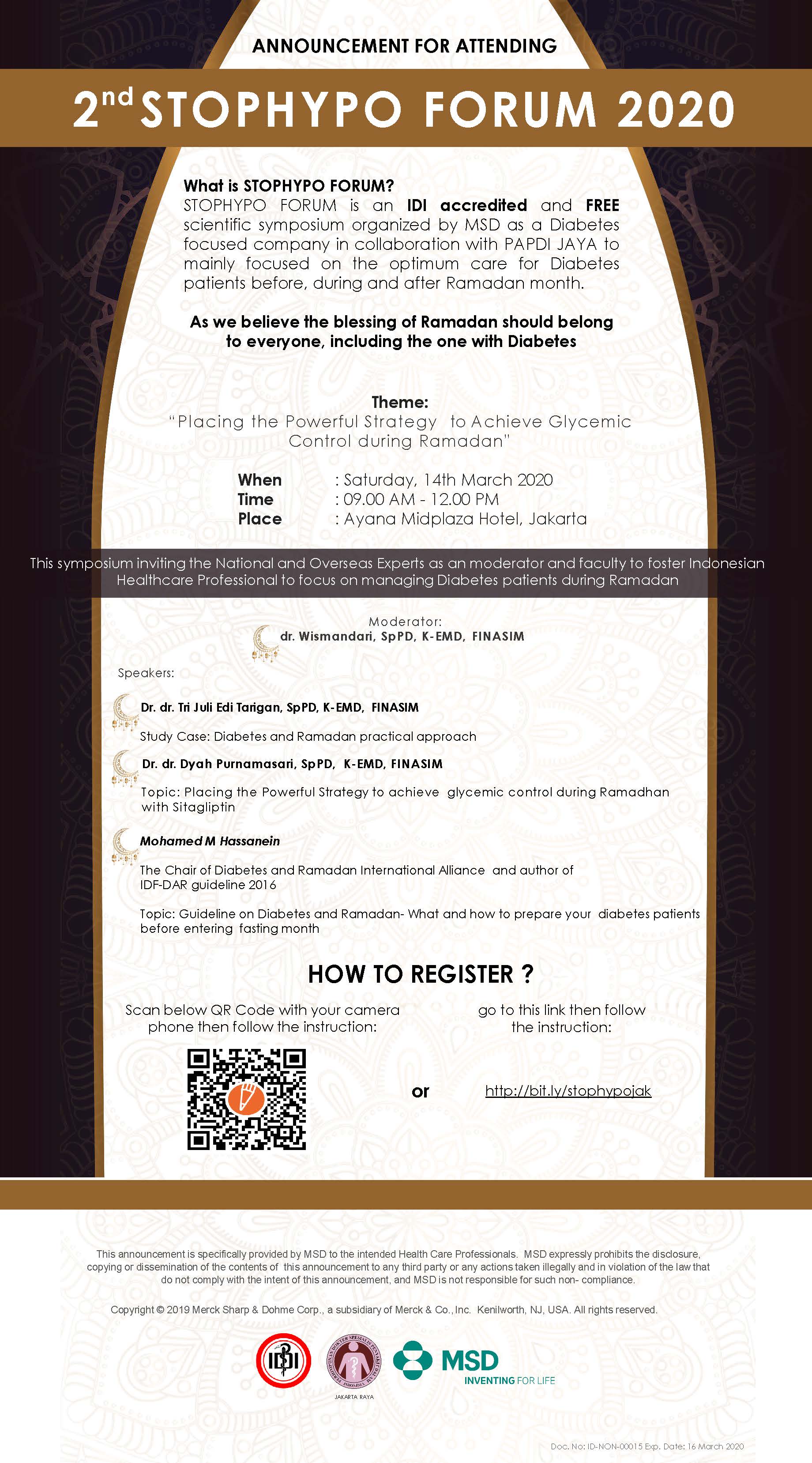STOPHYPO FORUM is an IDI accredited and FREE scientific symposium organized by MSD as a Diabetes focused company in collaboration with PAPDI JAYA to mainly focused on the cruciality in placing the optimum care for Diabetes patients before, during and after Ramadan month.