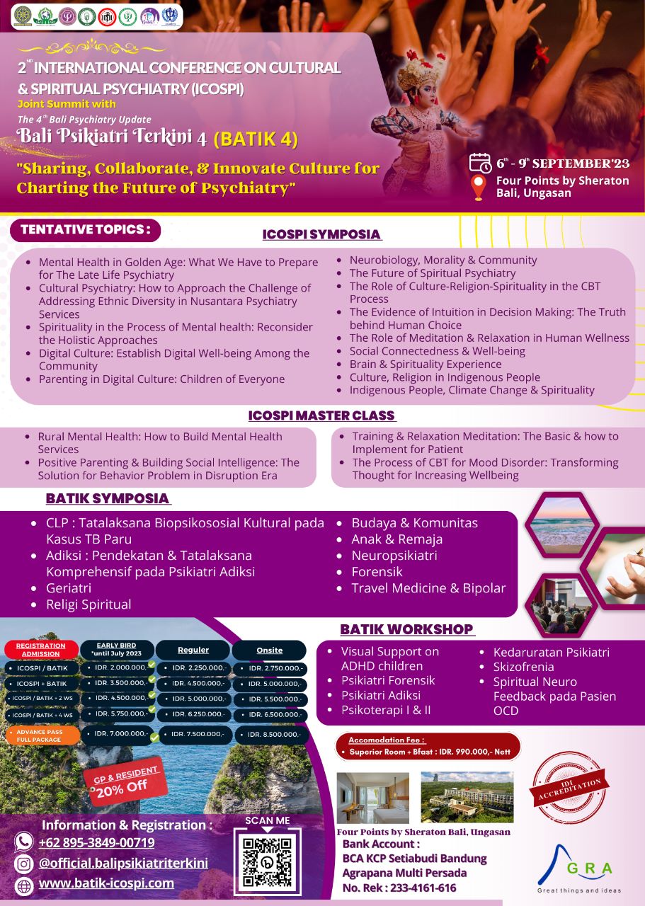 The subject of Bali Psikiatri Terkini 4 / The 4th Bali Psychiatry Update, Join Summit with 2st International Conference on Cultural and Spiritual Psychiatry (ICOSPI) is “Sharing, Collaborate, and Innovate Culture for Charting the Future of Psychiatry". I hope that this event will be the start of closer collaboration between psychiatry professionals and help define a better future for society.