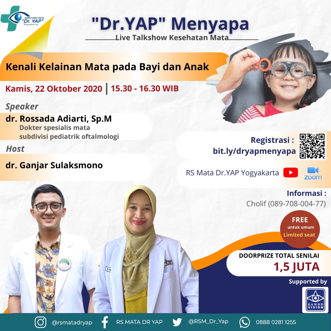 Penglihatan memiliki peran penting dalam perkembangan fisik, kognitif, dan sosial pada anak. Pemeriksaan mata sejak dini menjadi kunci dalam menjaga kesehatan mata. Oleh karena itu, mari kita "Kenali Kelainan Mata pada Bayi dan Anak" melalui Talkshow Online "Dr.YAP Menyapa" yang akan dilaksanakan :