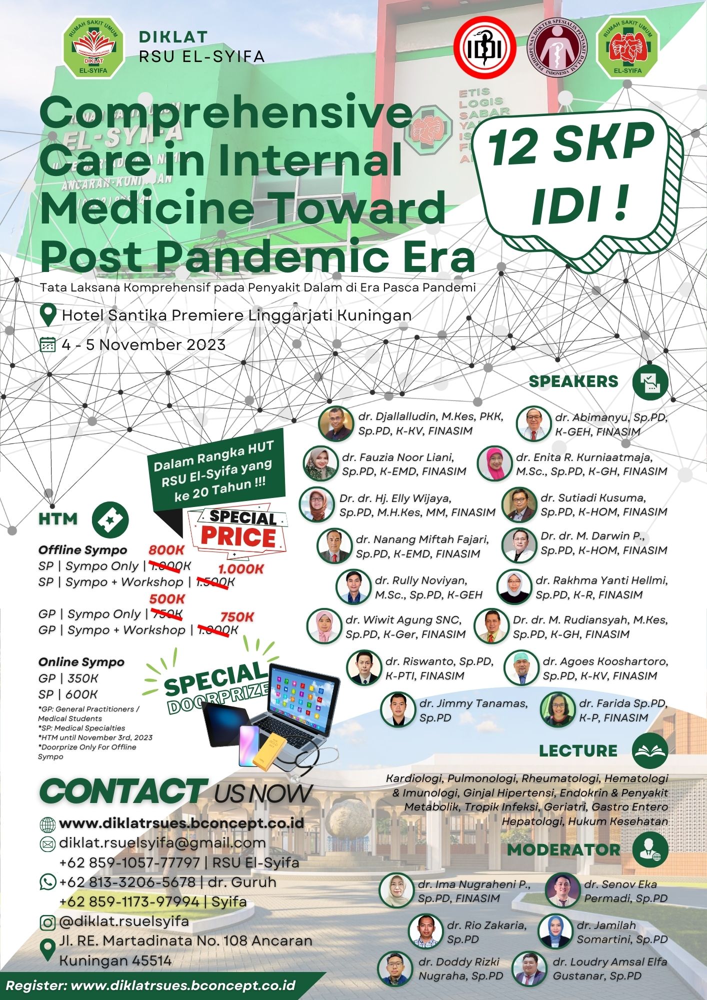 Hallo Sobat, dalam rangka menyongsong era pasca pandemi, RSU El-Syifa menghadirkan acara symposium bertajuk " Comprehensive Care in Internal Medicine Toward Post Pandemic Era " dengan 12 SKP IDI yang akan menjadi panggung bagi 16 pembicara dan 6 moderator terbaik di bidangnya. Dapatkan wawasan terkini tentang perawatan internal yang komprehensif.
