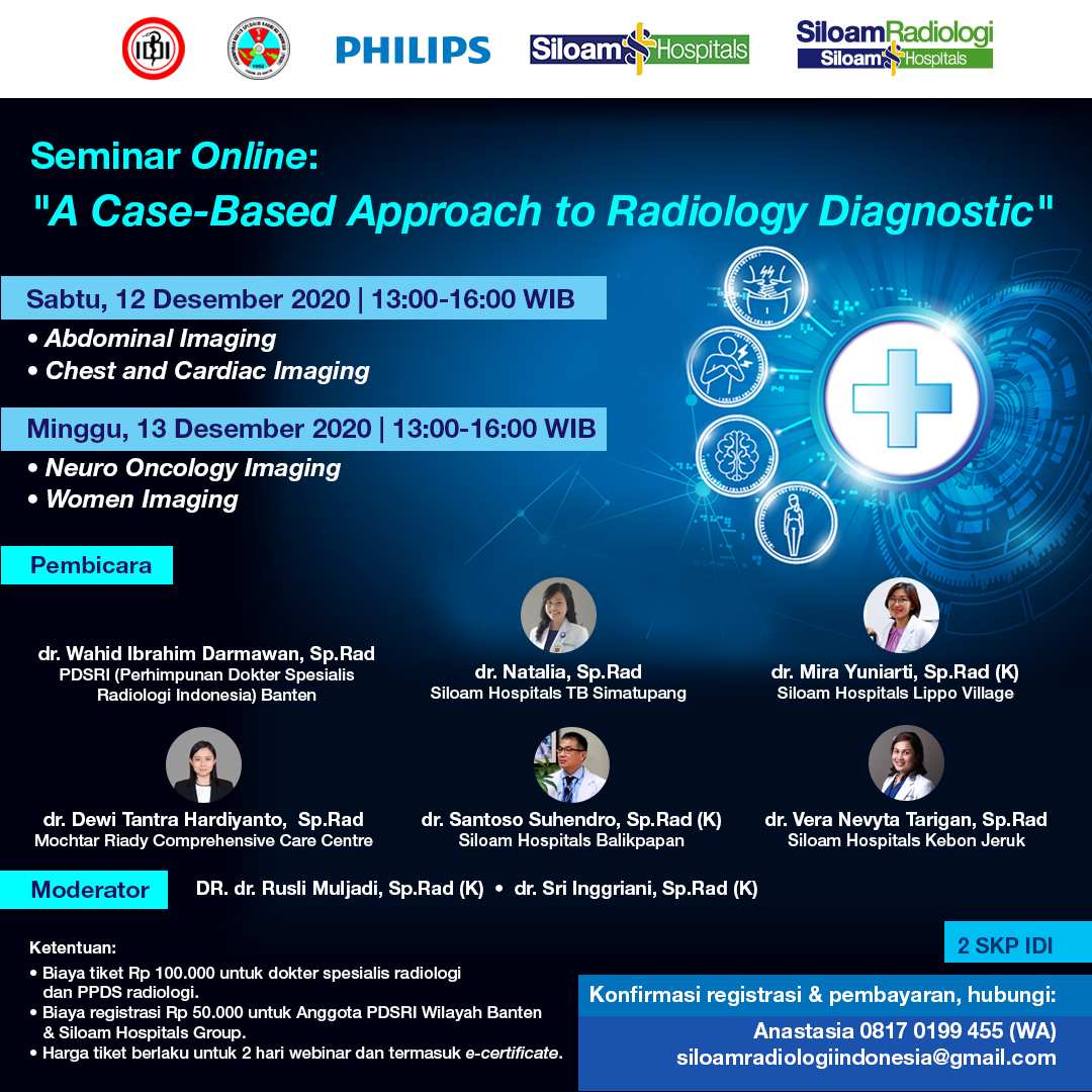 Siloam Radiologi Indonesia menyelenggarakan Seminar Medis Online bertemakan "A Case-Based Approach to Radiology Diagnostic" pada Sabtu, 12 Desember, 2020 - Minggu, 13 Desember, 2020