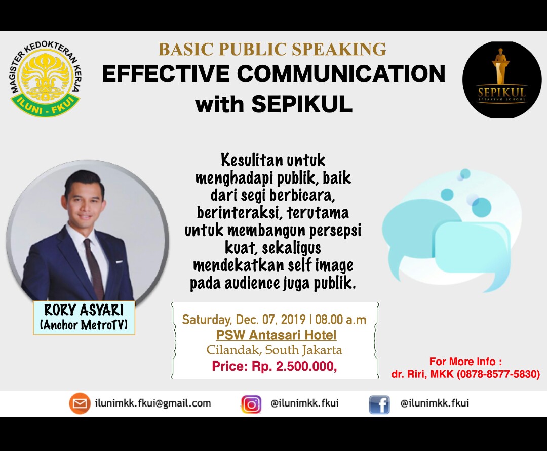 ILUNI MKK FK UI bekerjasama dengan SEPIKUL (Speaking School) Mempersembahkan WORKSHOP BASIC PUBLIC SPEAKING (Effective Communication) dengan pakar Mentor Public Speaking yaitu Anchor News TV Terkenal, salah satunya RORY ASYARI (Anchor Metro TV)