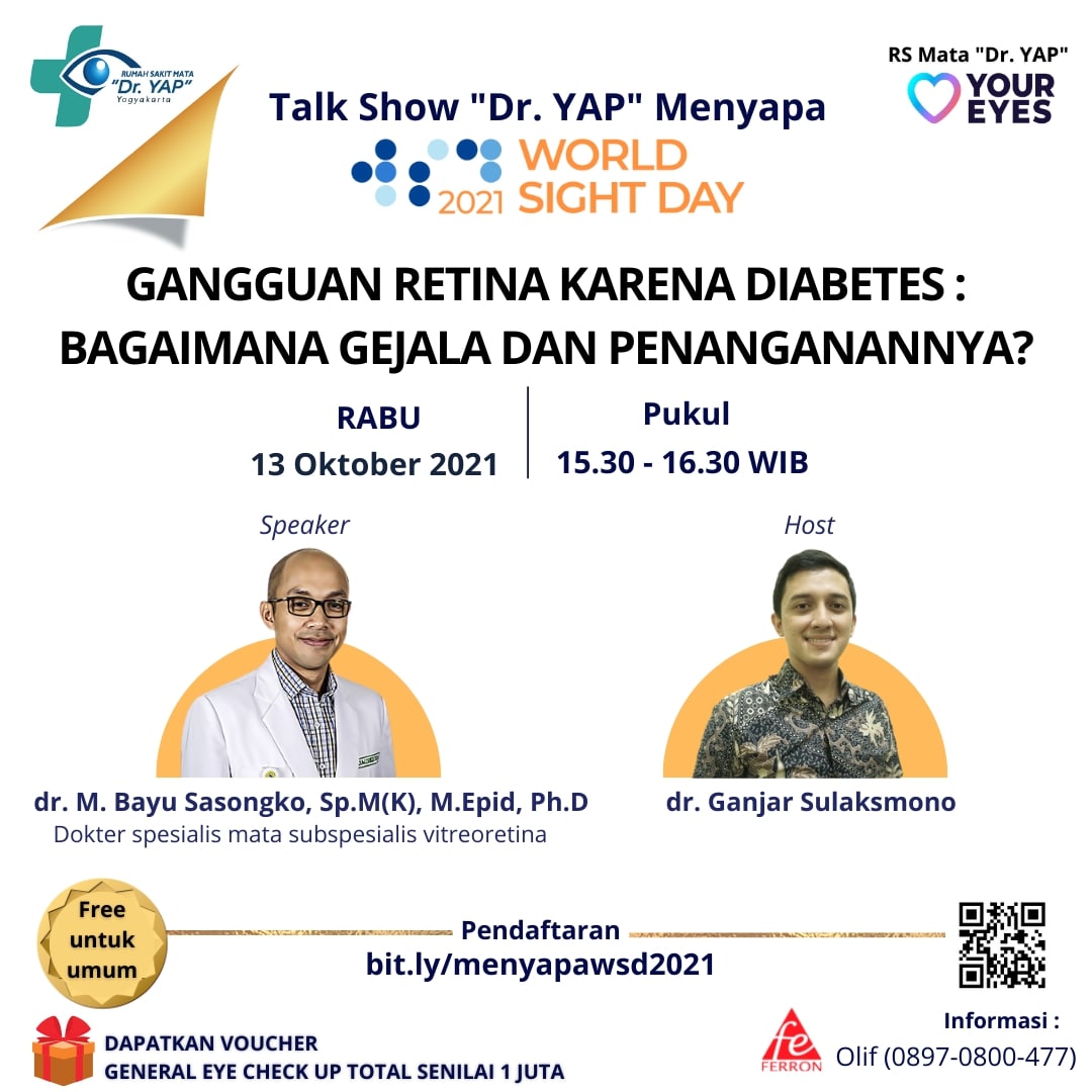 Sahabat eyecare, Diabetes Mellitus yang tidak terkontrol dapat menyebabkan gangguan pada retina mata. Bagaimana gejala dan penanganan gangguan retina karena diabetes? Mari temukan jawabannya melalui Talk Show "Dr. YAP" Menyapa Edisi Spesial World Sight Day 2021, dengan topik Gangguan Retina Karena Diabetes : Bagaimana Gejala dan Penanganannya? yang akan dilaksanakan :