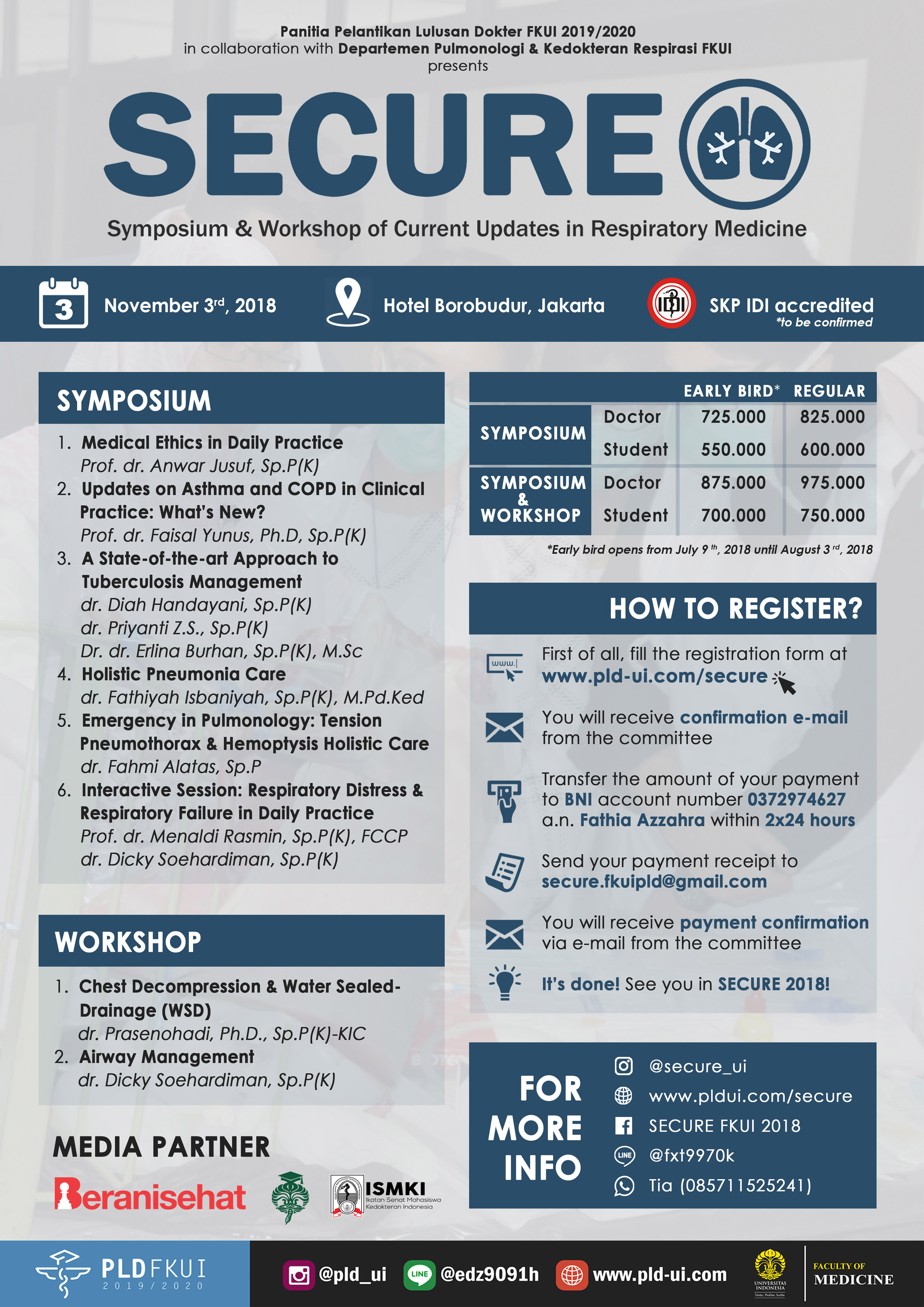 Symposium and Workshop of Current Updates in Respiratory Medicine (SECURE) hadir untuk memenuhi kebutuhan dokter umum dalam memahami dan memberikan informasi terbaru dalam kasus-kasus di bidang pulmonologi. Dengan diadakannya acara ini, diharapkan tenaga kesehatan, terutama yang bekerja di pelayanan primer, dapat menangani kasus-kasus pulmonologi yang termasuk kompetensinya sesuai dengan perkembangan terbaru.